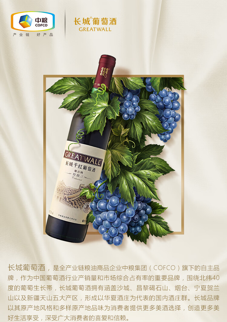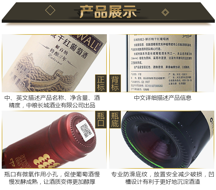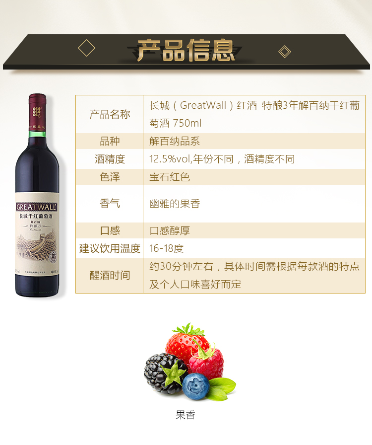 颜色:宝石红;口感:饱满;特性:普通餐酒,其它;国产/进口:国产;适用场景:家庭聚会,礼节拜访,商务宴请,婚礼婚宴,情侣约会,自斟自饮,派对活动;包装:瓶装;酸度:中酸;类别:红葡萄酒;葡萄品种:其它;类型:静止酒;香型:果香;产地:中国大陆;容量:750mL;甜度:干型;系列:特酿;保质期:3650天;酒精度:12.5%vol;原产地:中国大陆;存储方法:避免阳光直射,于5℃~25℃干燥通风处卧放或倒放为宜;容量:750ml;产品重量:1.29kg;包装清单:长城特酿3年解百纳干红葡萄酒750ml *1;