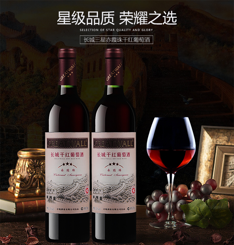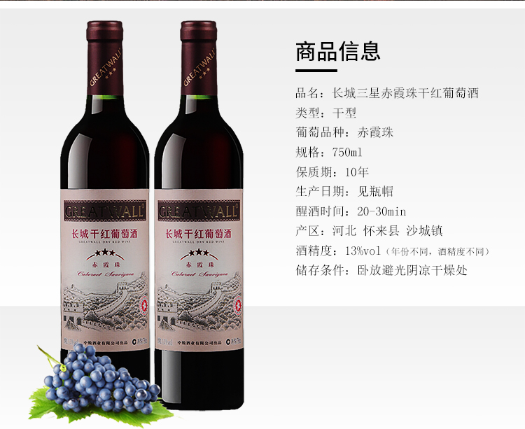颜色:宝石红;口感:柔和;特性:其它;国产/进口:国产;适用场景:礼节拜访,商务宴请,婚礼婚宴,情侣约会,家庭聚会,自斟自饮,派对活动;包装:整箱装;酸度:中酸;类别:红葡萄酒;葡萄品种:赤霞珠(Cabernet Sauvignon);类型:静止酒;香型:果香;产地:中国大陆;容量:750mL;甜度:干型;保质期:3650天;酒精度:13%vol;原产地:中国大陆;存储方法:避免阳光直射,于5℃~25℃干燥通风处卧放或倒放为宜;容量:750ml*6瓶;产品重量:10kg;包装清单:长城星级系列 三星赤霞珠干红葡萄酒 整箱装 750ml*6瓶 *1箱;