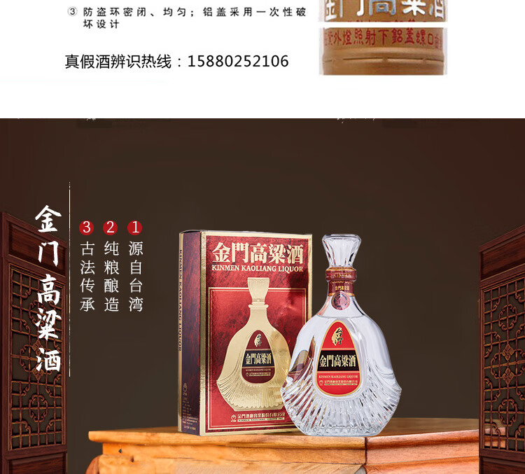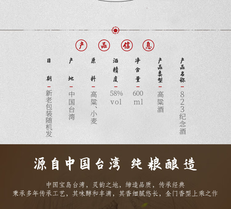 包装:瓶装;容量:500-749mL;香型:清香型;产地:中国台湾;度数:50度及以上;酒精度:58%vol;容量:600ml;产品重量:1400g;包装清单:金门高粱酒 白酒 823纯酿 清香型 58度 600ml 单瓶装*1瓶;