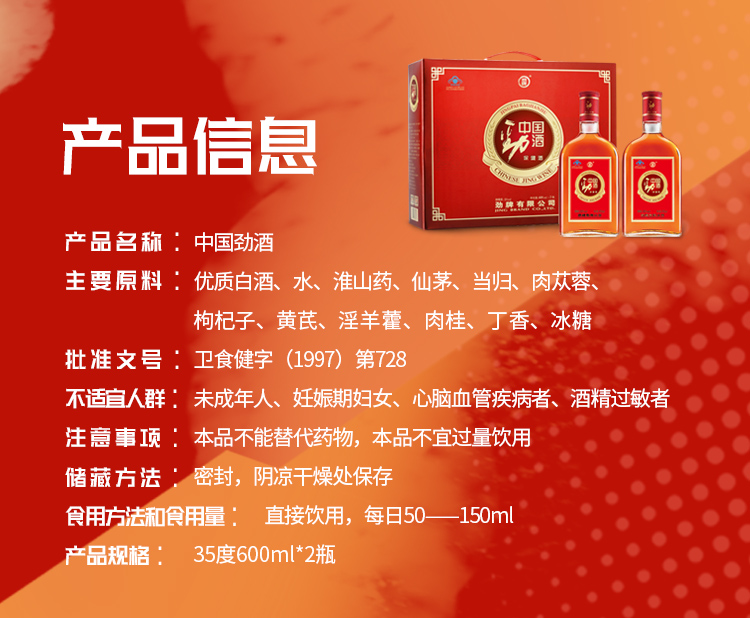 适用场景:家庭聚会,礼节拜访,自斟自饮;包装:礼盒装;容量:500-999mL;度数:35-39度;产地:湖北;保质期:3年;酒精度:35;存储方法:阴凉干燥处;容量:600mL;产品重量:2.56kg;包装清单:中国劲酒礼盒 35度 600ml x 2瓶;