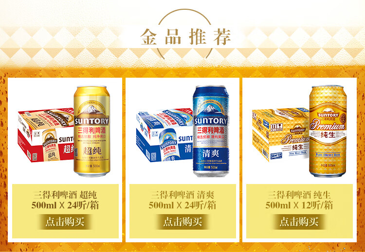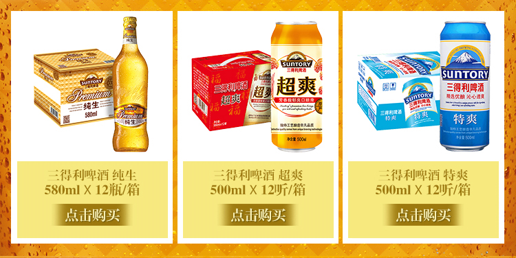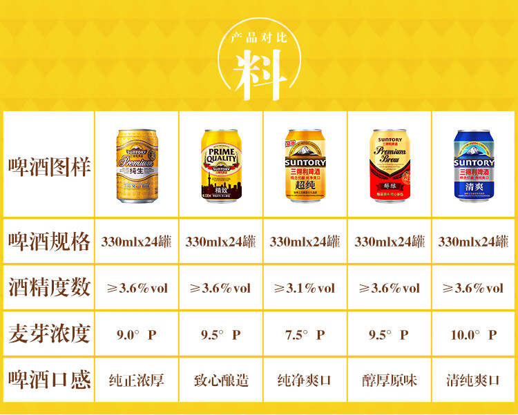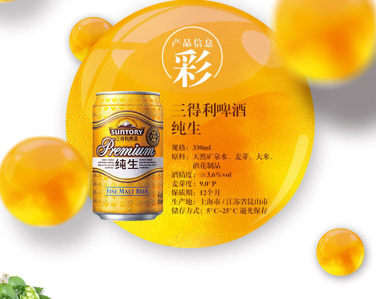国产/进口:国产;产地:中国大陆;适用场景:家庭聚会,自斟自饮,烧烤撸串,派对必备,酒吧夜店;包装:听装;容量:330mL;类别:黄啤酒;原料:天然矿泉水、麦芽、大米、酒花制品;系列:纯生;保质期:12个月;酒精度:≥3.6%vol;原产地:中国大陆;原麦汁浓度:9.0;存储方法:5°C-25°C 避光保存;产品重量:8.56kg;容量:330ml;包装清单:三得利(Suntory)纯生330ml×24听整箱装一箱;