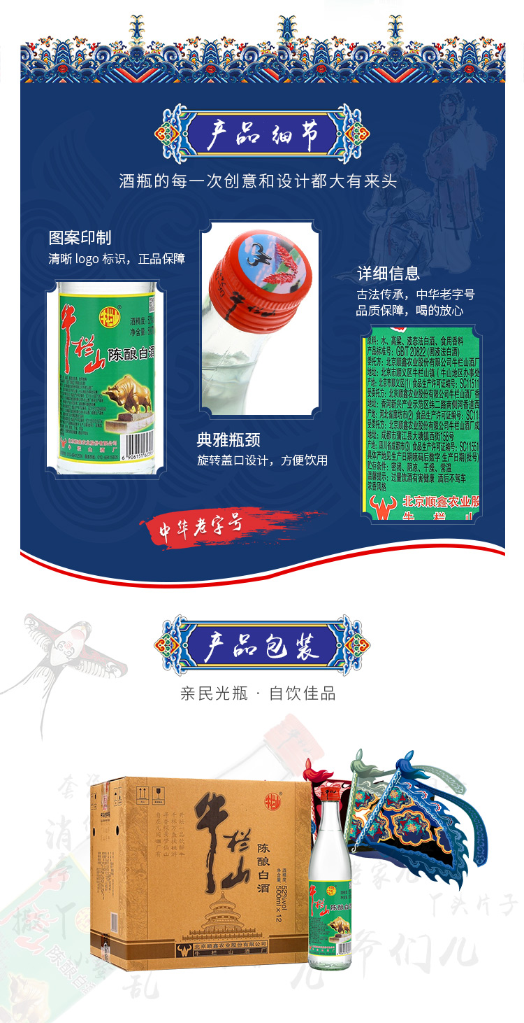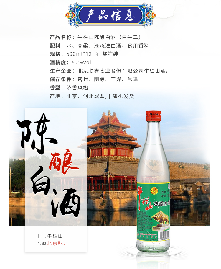 包装:整箱装;容量:500-749mL;香型:浓香型;产地:北京;度数:50度及以上;酒精度:52%vol;容量:500ml;产品重量:12000g;包装清单:牛栏山 陈酿白酒 52度 500ml*12瓶 整箱装 (白牛二/牛白瓶)浓香风格白酒*1;