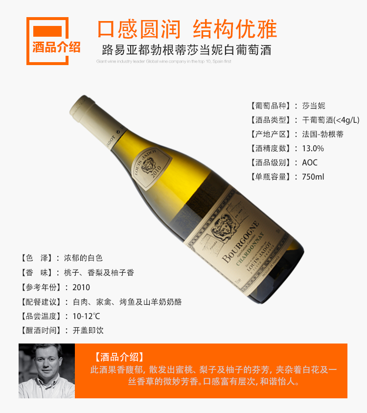 颜色:柠檬黄;口感:清新;特性:其它;国产/进口:进口;适用场景:婚礼婚宴,家庭聚会,闺蜜私语,派对活动;包装:其它;酸度:中酸;类别:白葡萄酒;葡萄品种:其它,霞多丽(Chardonnay);香型:矿物,奶油,花香,果香,其它;产地:法国;容量:750mL;甜度:其它;保质期:10年;酒精度:12.5%vol;原产地:法国;存储方法:避光,阴凉处;容量:750ml;产品重量:1.5kg;包装清单:葡萄酒 × 1瓶;