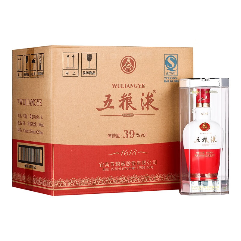 包装:整箱装;容量:750mL及以上;香型:浓香型;度数:35-39度;香型:浓香型;产地:四川;酒精度:39度;包装:整箱装;产品重量:9300g;容量:500ml*6;包装清单:五粮液 1618 39度 500ml 1*6瓶;