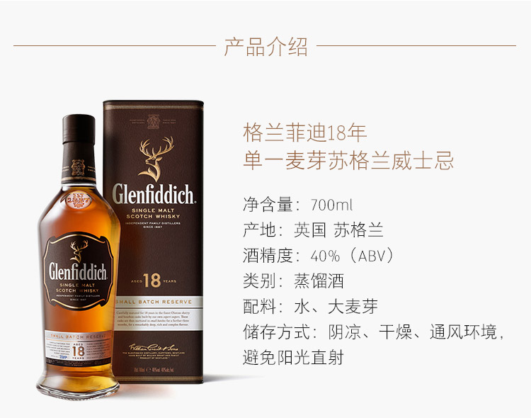 类型:单一麦芽威士忌;产地:苏格兰;适用场景:自斟自饮,亲友馈赠,家庭聚会,商务宴请;包装:瓶装;容量:700-999mL;阶段:进阶优选;原料:水、大麦芽、焦糖色;保质期:无;酒精度:40%vol;存储方法:常温避光保存;产品重量:1.5kg;容量:700mL;包装清单:格兰菲迪(Glenfiddich)18年苏格兰达夫镇单一麦芽威士忌700ml *1;