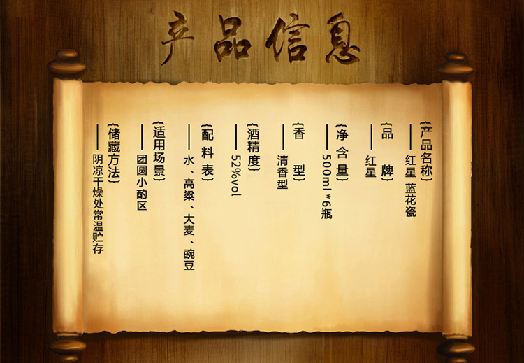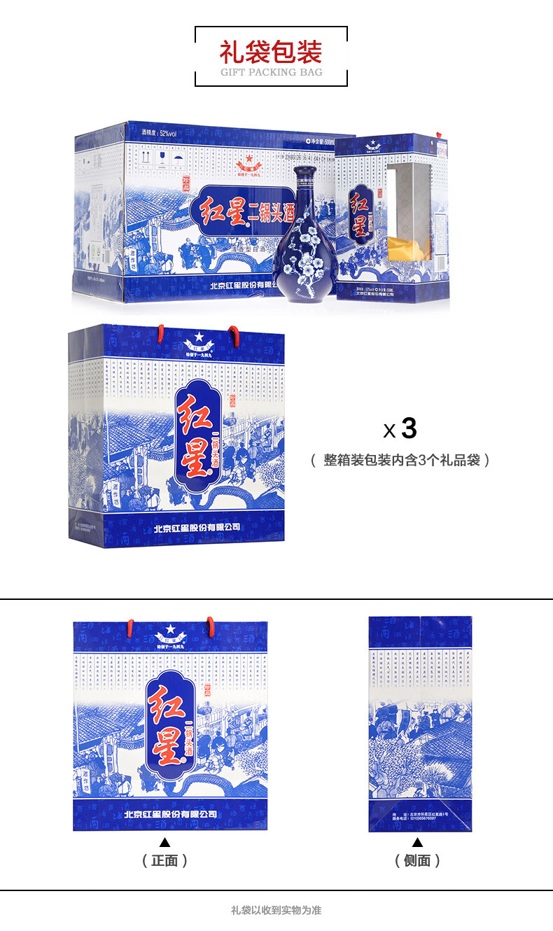 包装:整箱装;容量:376-499mL;香型:清香型;度数:50度及以上;香型:清香型;产地:北京;酒精度:52%vol;包装:整箱装;产品重量:8450g;容量:500ml;包装清单:红星 蓝花瓷珍品二锅头52度 500ml *6瓶 整箱装;