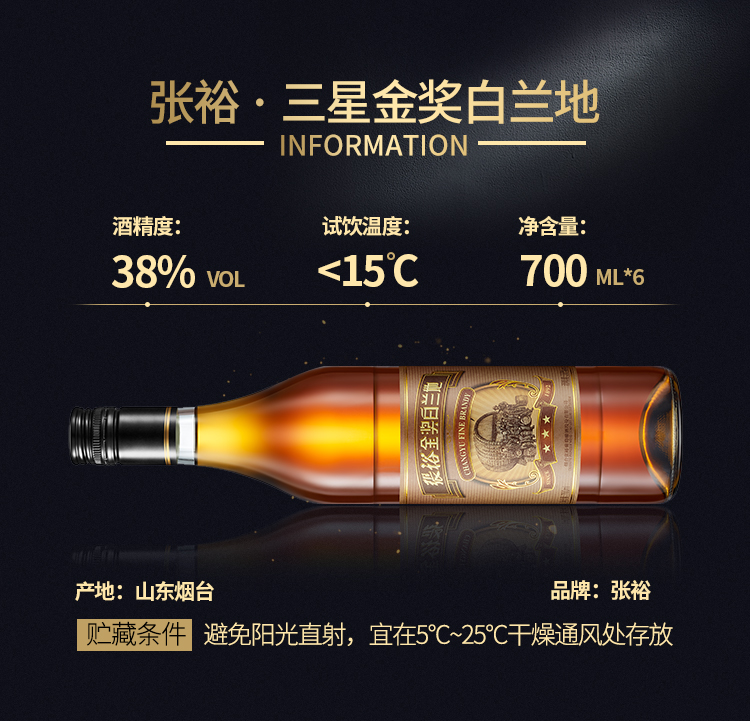 颜色:琥珀;口感:强劲;特性:其它;国产/进口:国产;适用场景:礼节拜访,商务宴请,婚礼婚宴,情侣约会,家庭聚会,自斟自饮,闺蜜私语,派对活动;包装:整箱装;酸度:低酸;类别:白葡萄酒;葡萄品种:其它;类型:静止酒;香型:果香;产地:中国大陆;容量:376-749mL;甜度:干型;系列:白兰地;保质期:无;酒精度:38%vol;原产地:中国大陆;存储方法:避免阳光直射,于5℃~25℃干燥通风处卧放或倒放,有少量沉淀不影响饮用;容量:700ml;产品重量:6.85kg;包装清单:白兰地700ml x6;
