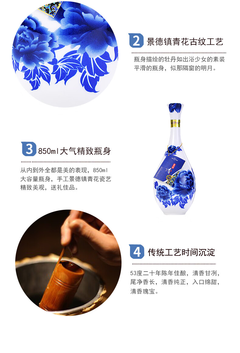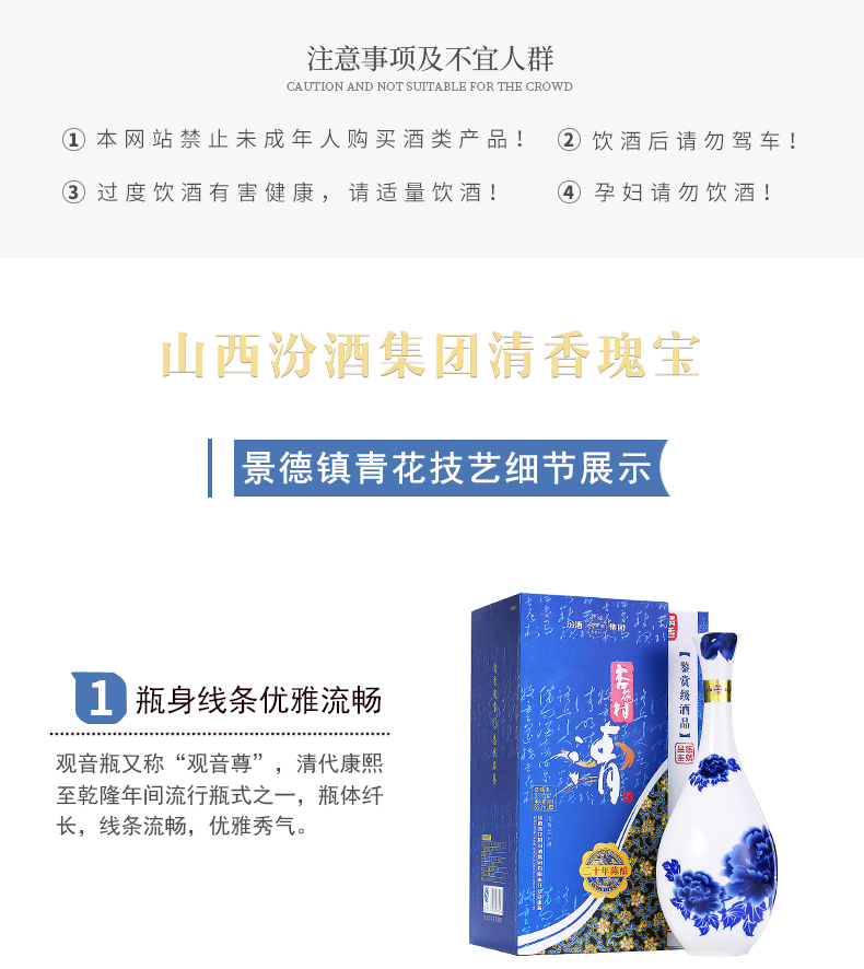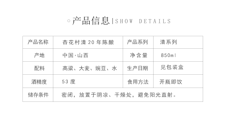 包装:瓶装;容量:750mL及以上;香型:清香型;度数:50度以上;容量:850ml;产品重量(kg):2.36;包装:单瓶;存储方法:干燥 避光;酒精度:53度;香型:清香型;等级:优级;省份:山西;包装清单:汾酒杏花村清20年53度850ml*1;