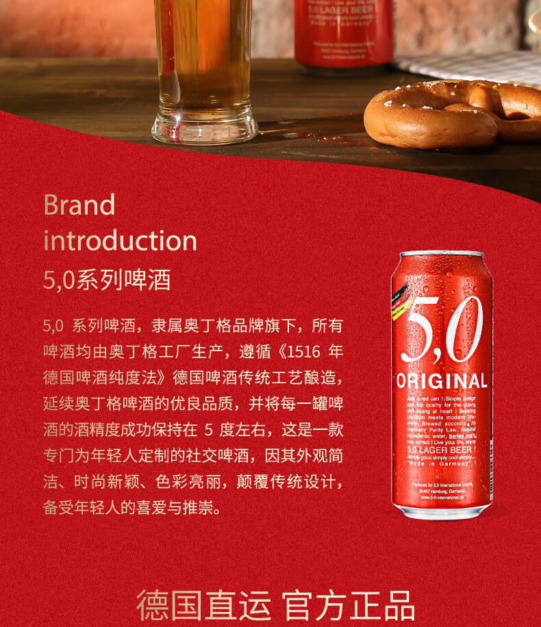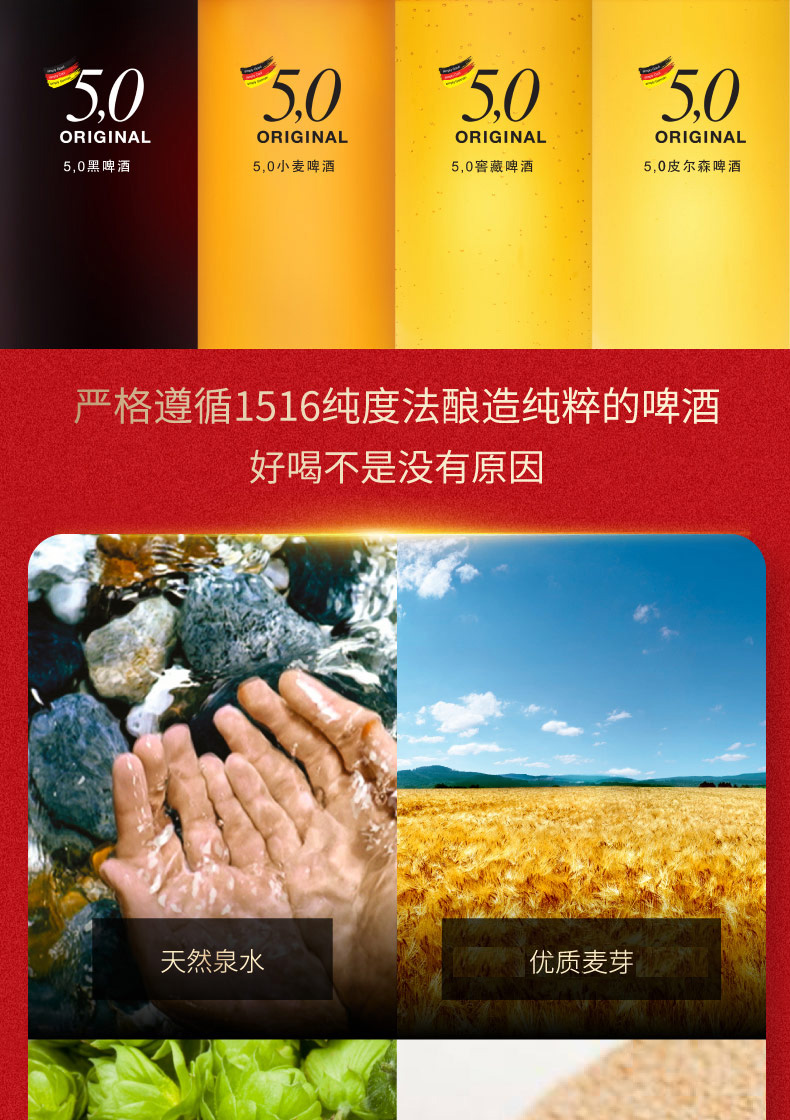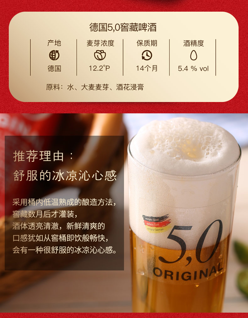 国产/进口:进口;产地:德国;适用场景:家庭聚会,礼节拜访,情侣约会,自斟自饮,派对必备,烧烤撸串,酒吧夜店;包装:组合装;容量:500mL;类别:黄啤酒;原料:水、大麦麦芽、酒花浸膏(即啤酒花萃取物);保质期:420天;酒精度:5.4%vol;原产地:德国;原麦汁浓度:12.2°P;存储方法:置于阴凉处;容量:500ml;产品重量:0kg;包装清单:德国 5.0窖藏啤酒 500ml*24听 整箱装;