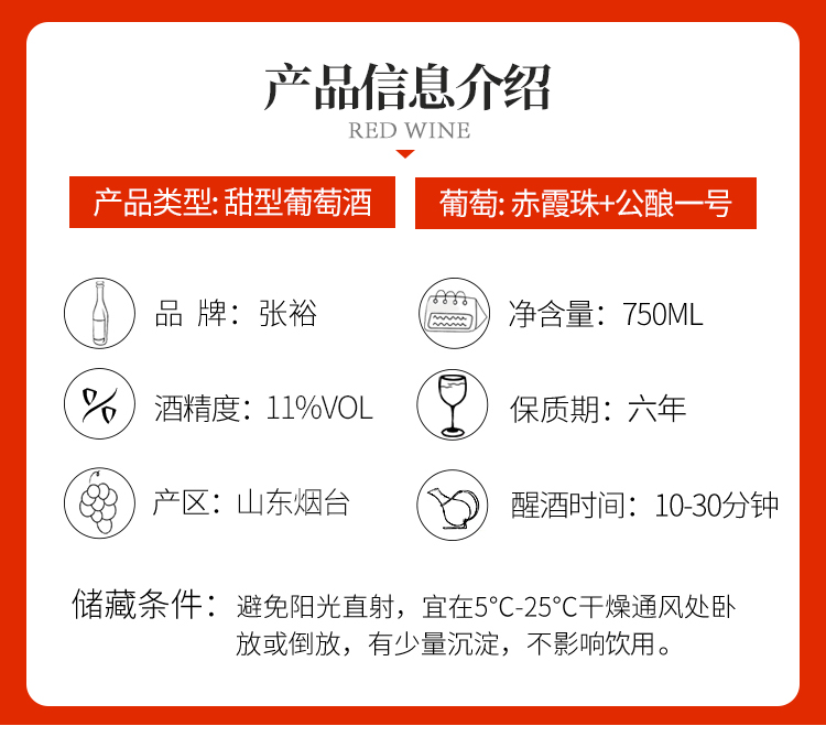 颜色:石榴红;口感:柔和;特性:其它;国产/进口:国产;适用场景:礼节拜访,商务宴请,婚礼婚宴,情侣约会,家庭聚会,自斟自饮,闺蜜私语,派对活动;包装:瓶装;酸度:低酸;类别:红葡萄酒;葡萄品种:其它,赤霞珠(Cabernet Sauvignon);类型:静止酒;香型:果香;产地:中国大陆;容量:750mL;甜度:甜型;系列:甜酒;保质期:6年;酒精度:11%vol;原产地:中国大陆;存储方法:避免阳光直射,于5℃~25℃干燥通风处卧放或倒放,有少量沉淀不影响饮用;容量:750ml;产品重量:1.24kg;包装清单:葡萄酒750ml x1;