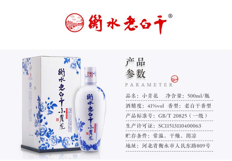 包装:整箱装;容量:500-749mL;香型:老白干香型;度数:40-49度;香型:老白干香型;产地:河北;酒精度:41%vol;包装:整箱装;容量:500ml*6;产品重量:7770g;包装清单:衡水老白干小青花青瓷风韵41度整箱装500ml×6瓶;
