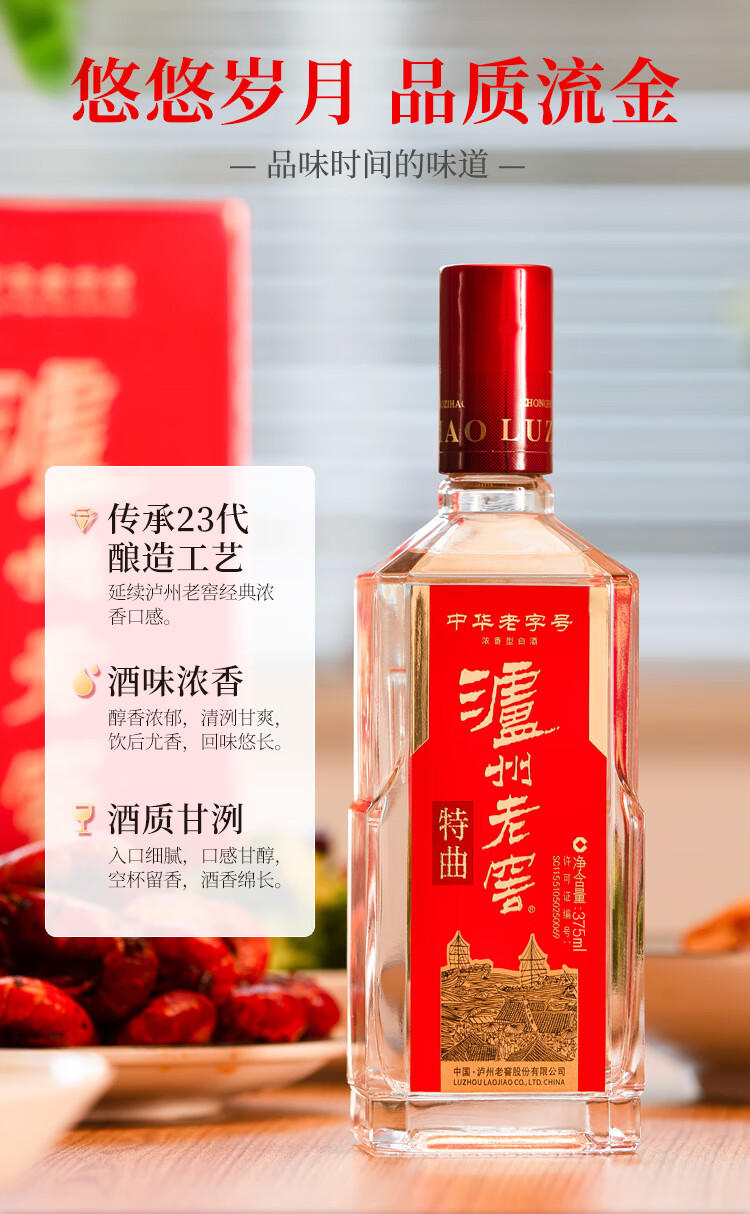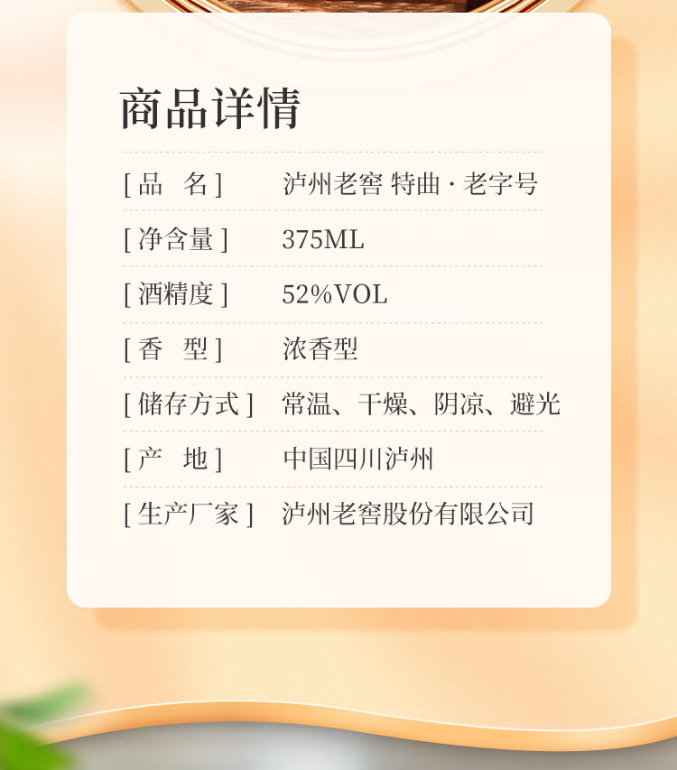 包装:整箱装;容量:375mL及以下;香型:浓香型;产地:四川;度数:50度及以上;酒精度:52%vol;容量:375ml;产品重量:1000g;包装清单:特曲 52度 375ML × 1;