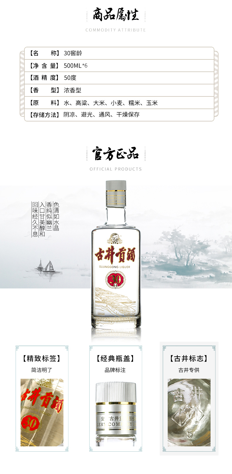 包装:整箱装;容量:376-499mL;香型:浓香型;产地:安徽;度数:50度及以上;酒精度:50%vol;容量:500;产品重量:8.5g;包装清单:古井贡酒 30窖龄50度整箱装500ml×6;