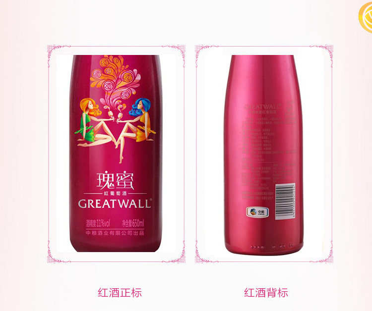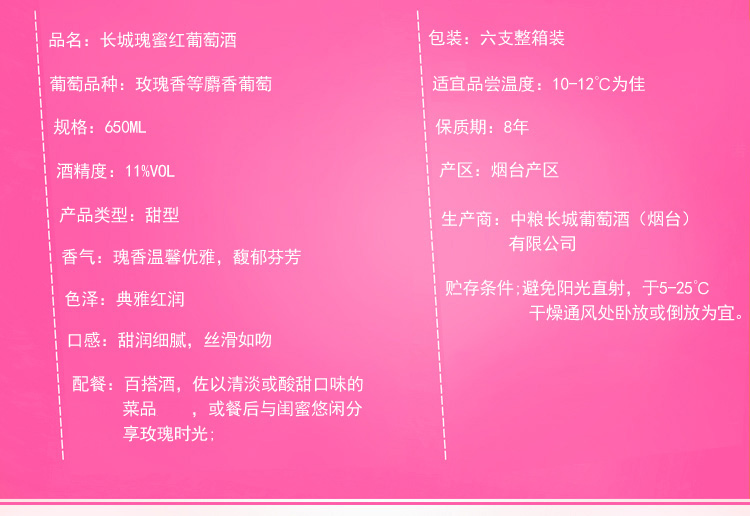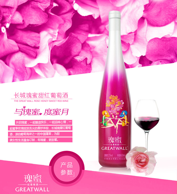 颜色:石榴红;口感:清新;特性:普通餐酒,其它;国产/进口:国产;适用场景:家庭聚会,礼节拜访,商务宴请,婚礼婚宴,情侣约会,自斟自饮,派对活动;包装:瓶装;酸度:中酸;类别:红葡萄酒;葡萄品种:其它;类型:静止酒;香型:花香,果香;产地:中国大陆;容量:376-749mL;甜度:甜型;系列:瑰蜜;保质期:2920天;酒精度:11%vol;原产地:中国大陆;存储方法:避免阳光直射,于5℃~25℃干燥通风处卧放或倒放为宜;容量:650ml;产品重量:1.2kg;包装清单:长城 (GreatWall) 瑰蜜红葡萄酒 650ml *1瓶;