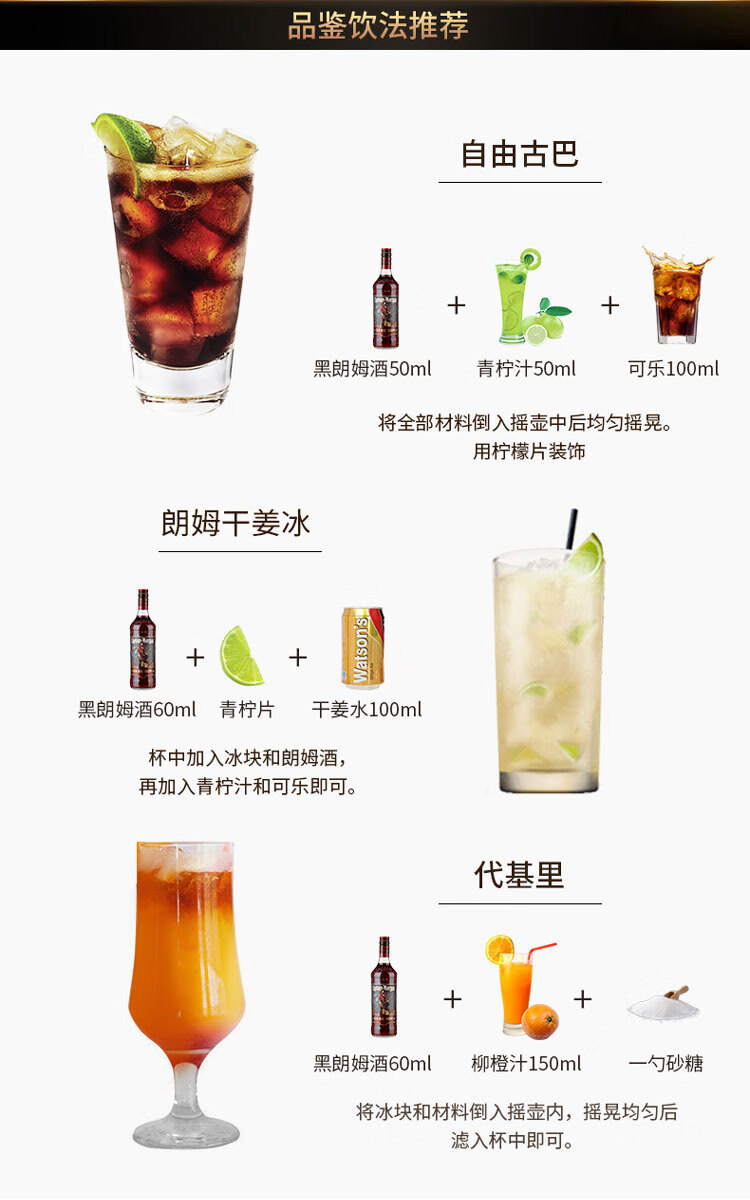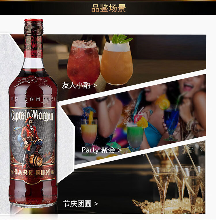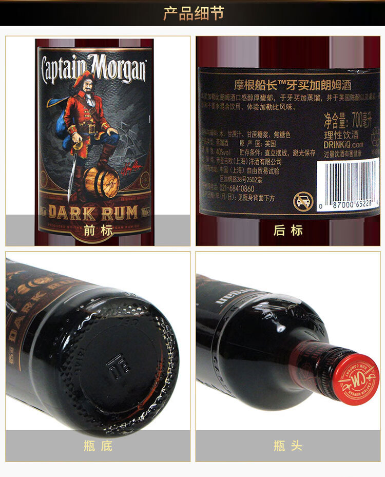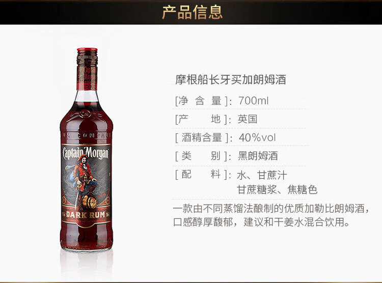 适用场景:家庭聚会;包装:瓶装;容量:700-999mL;国产/进口:进口;产地:英国;原料:水、朗姆酒、焦糖色;保质期:无;酒精度:40%vol;存储方法:常温避光保存;容量:700mL;产品重量:1.5kg;包装清单:摩根船长(Captain Morgan)洋酒 摩根黑朗姆酒700ml *1;