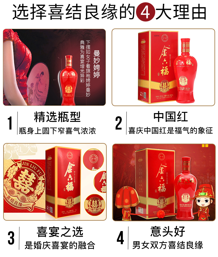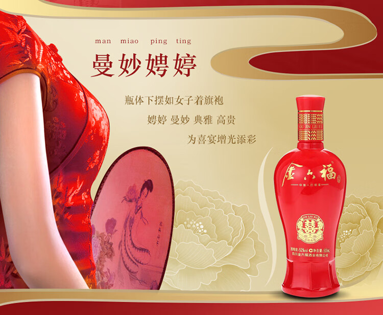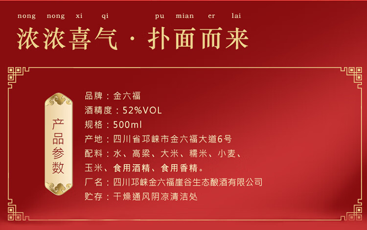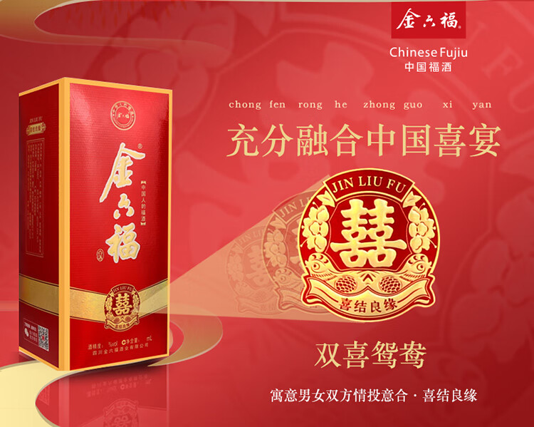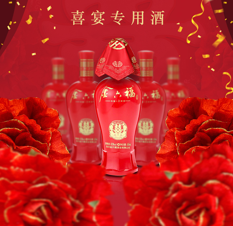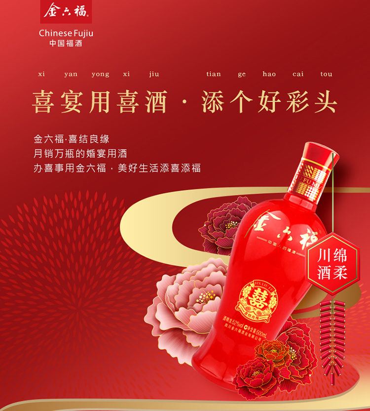 包装:整箱装;容量:500-749mL;香型:其它;产地:四川;度数:50度及以上;酒精度:52%vol;容量:500;产品重量:500g;包装清单:高度白酒 金六福 喜结良缘52度整箱装500ml*6*1;