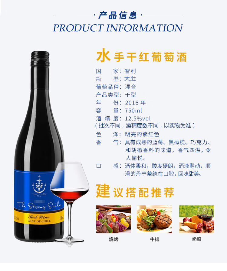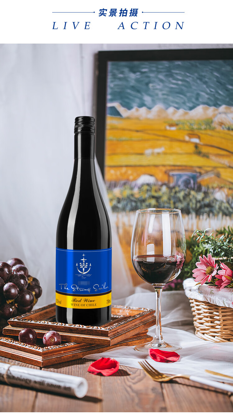颜色:宝石红;口感:柔和;特性:普通餐酒;国产/进口:进口;适用场景:礼节拜访,商务宴请,婚礼婚宴,情侣约会,家庭聚会,自斟自饮,闺蜜私语,派对活动;包装:整箱装;酸度:低酸;类别:红葡萄酒;葡萄品种:其它;类型:静止酒;香型:果香;产地:智利;容量:750mL;甜度:干型;保质期:3650天;酒精度:12.5;原产地:智利;存储方法:平放、倒置于阴凉处保存为宜;容量:750;产品重量:8.6kg;包装清单:智利进口红酒 智利水手干红葡萄酒750ml*6瓶 整箱装;