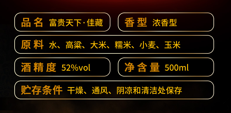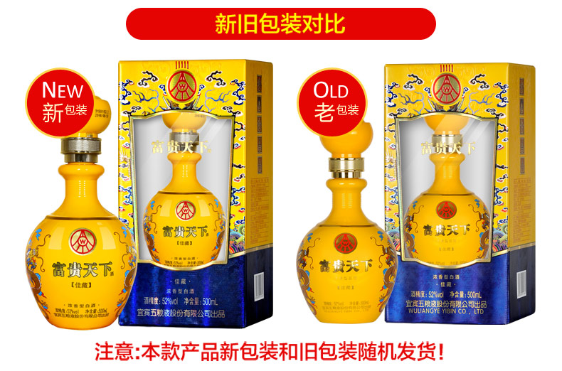 包装:整箱装;容量:500-749mL;香型:浓香型;产地:河北;度数:50度及以上;酒精度:52%vol;容量:500ml;产品重量:8200g;包装清单:五粮液股份公司 富贵天下 佳藏 浓香型白酒 52度 整箱装 500ml*6瓶((新老包装随机发货));