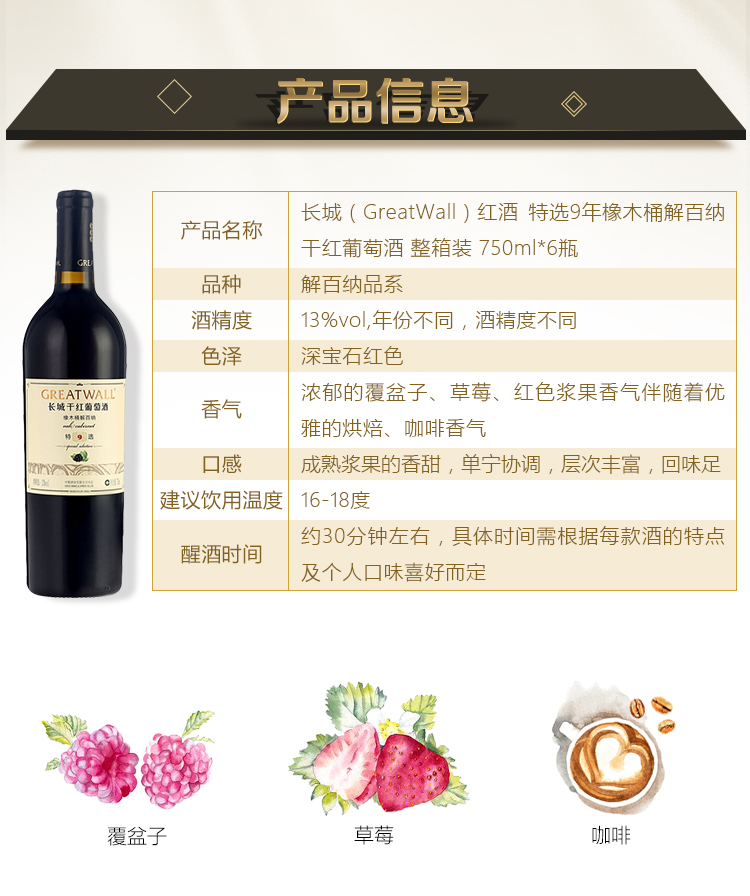 长城 特选9年橡木桶解百纳干红葡萄酒 750ml*6瓶 整箱装 中粮出品