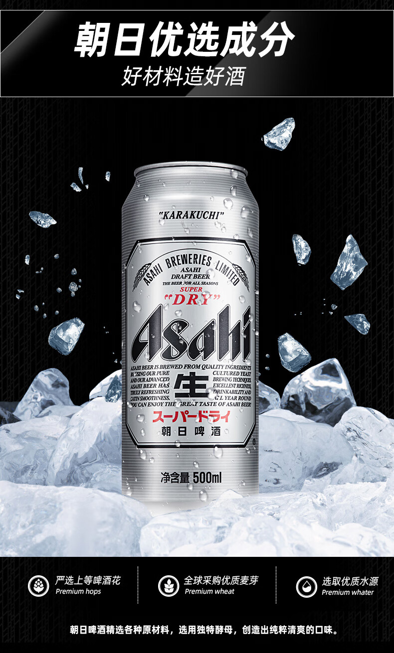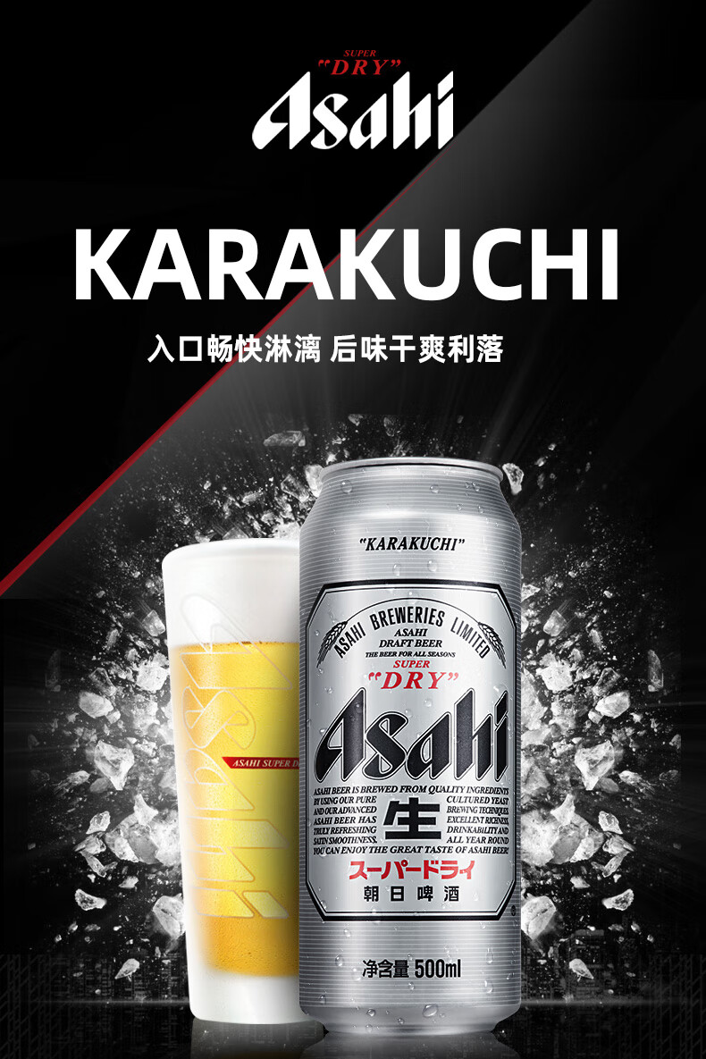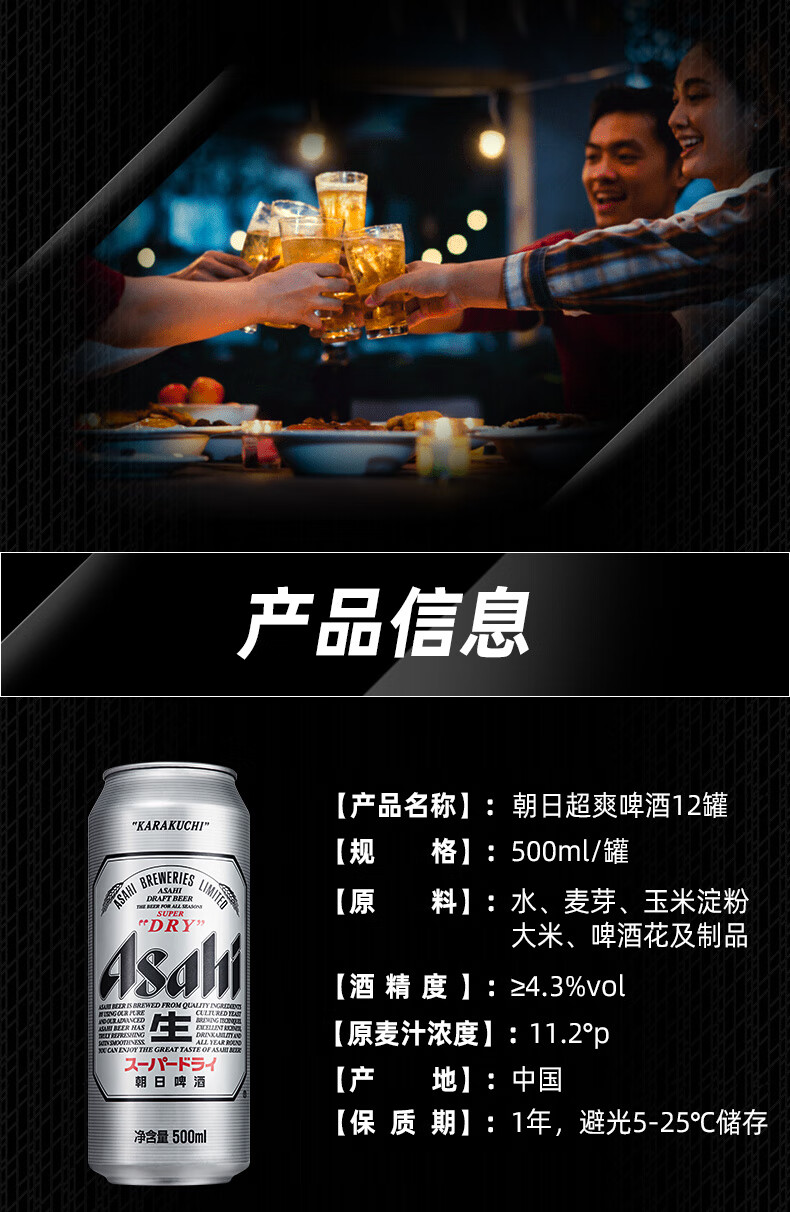 国产/进口:国产;产地:中国大陆;适用场景:家庭聚会,礼节拜访,情侣约会,自斟自饮,派对必备,烧烤撸串,酒吧夜店;包装:听装;容量:500mL;类别:黄啤酒;原料:水、麦芽、玉米淀粉、大米、啤酒花及制品;保质期:365天;酒精度:≧4.3;原产地:日本;原麦汁浓度:11.2;存储方法:于5-25℃避光处保存;产品重量:6.63kg;容量:500ml;包装清单:Asahi朝日啤酒 Asahi(超爽生) 500ml*12听 整箱装;