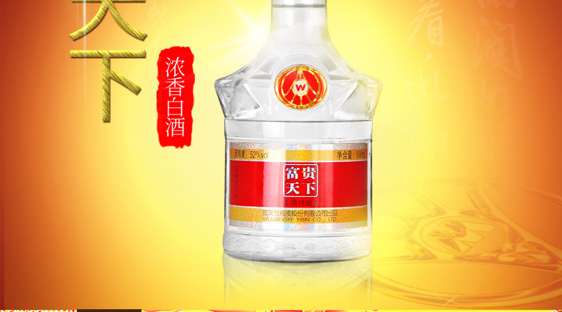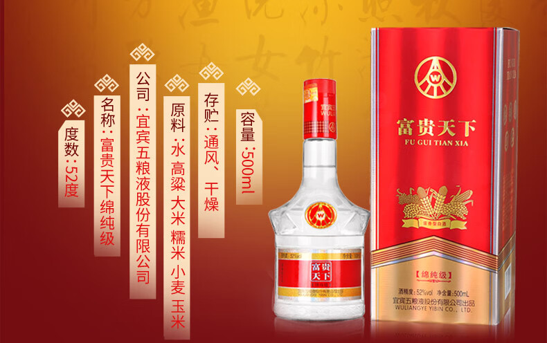 包装:整箱装;容量:500-749mL;香型:浓香型;产地:河北;度数:50度及以上;酒精度:52%vol;容量:500ml;产品重量:1000g;包装清单:五粮液股份公司 富贵天下 绵纯级 浓香型白酒 52度 整箱装 500ml*6瓶(新老包装随机发货);