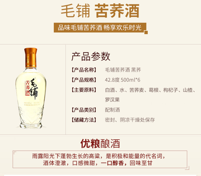 包装:整箱装;容量:500-749mL;香型:其它;产地:湖北;度数:40-49度;酒精度:42.8%vol;容量:500ml;产品重量:10040g;包装清单:劲牌 毛铺苦荞酒 黑荞 42度 500ml*6;