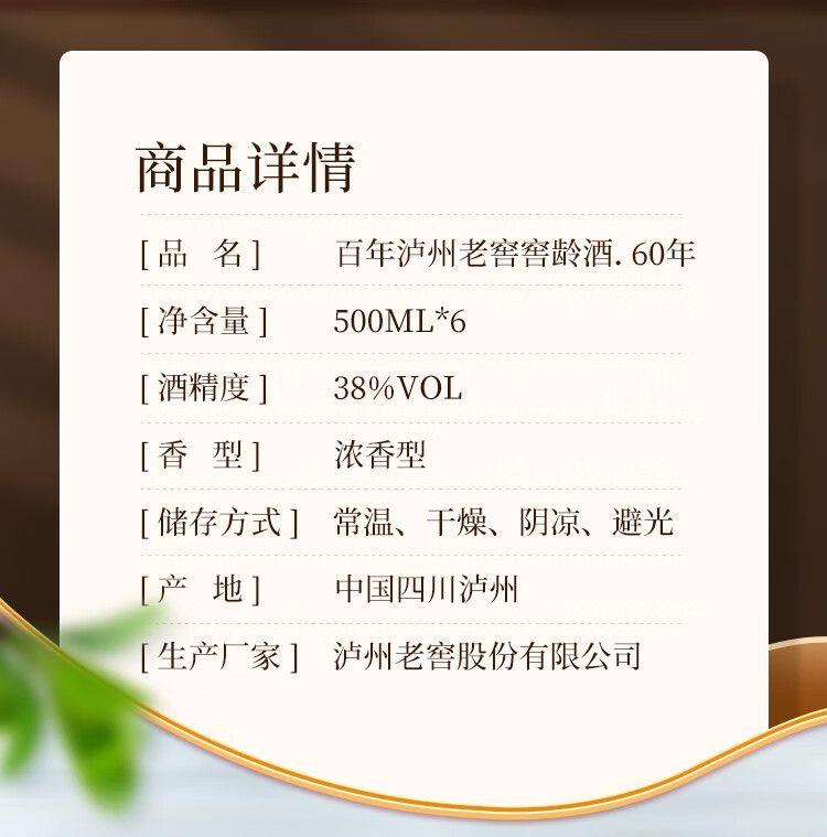 包装:整箱装;容量:376-499mL;香型:浓香型;产地:四川;度数:35-39度;酒精度:38%vol;容量:500ml*6;产品重量:10200g;包装清单:60年38度500ml×6;