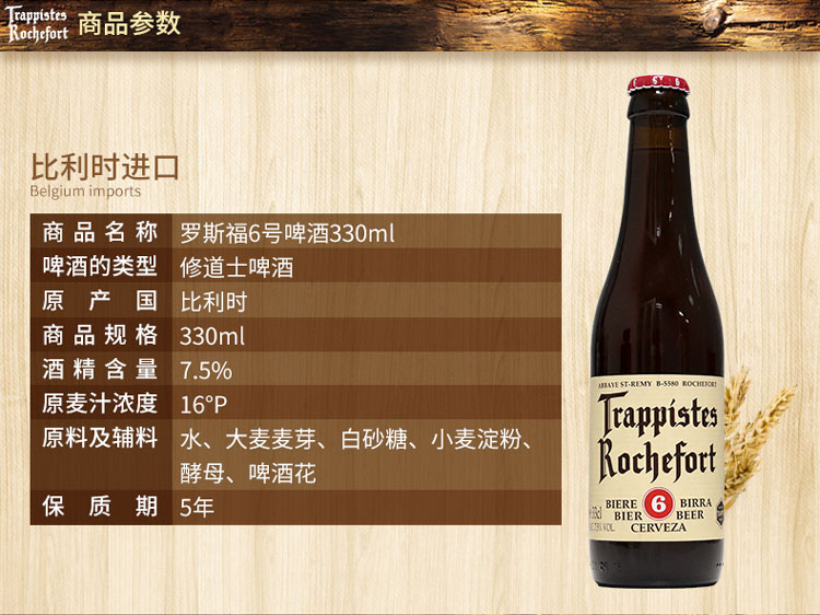 国产/进口:进口;产地:比利时;适用场景:礼节拜访,家庭聚会,自斟自饮,情侣约会;包装:瓶装;容量:330mL;类别:精酿;原料:水、大麦麦芽、白砂糖、小麦淀粉、酵母、啤酒花;保质期:5年;酒精度:7.5;原产地:比利时;原麦汁浓度:16;存储方法:请存放于阴凉干燥处,冷藏后饮用更佳。;产品重量:3.6kg;容量:330ml;包装清单:罗斯福6号啤酒 组合装330ml*6瓶x1;