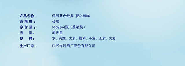 包装:整箱装;容量:750mL及以上;香型:浓香型;度数:40-49度;香型:浓香型;产地:江苏;酒精度:45;包装:整箱装;产品重量:0g;容量:500;包装清单:45度洋河梦之蓝M6 500ml×4 礼袋×2;