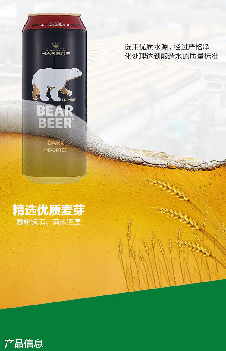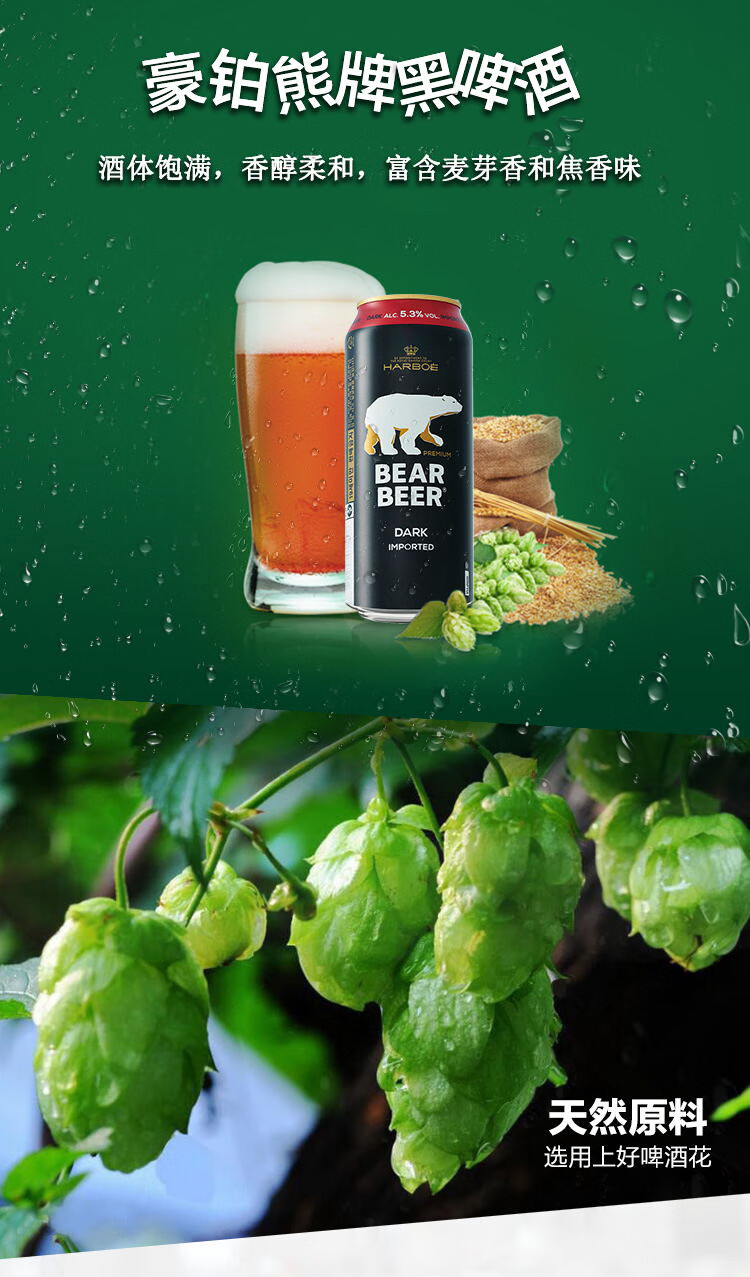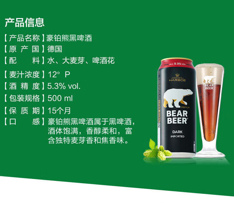 适用场景:家庭聚会,烧烤撸串,酒吧夜店;包装:听装;容量:500mL;类别:黑啤酒;国产/进口:进口;产地:德国;原料:水、大麦芽、啤酒花;保质期:15个月;酒精度:5.3%vol;原产地:德国;原麦汁浓度:12°P;存储方法:常温保存;产品重量:12.73kg;容量:500ml;包装清单:德国进口豪铂熊(Harboe)豪铂熊黑啤酒500ml*24整箱装;