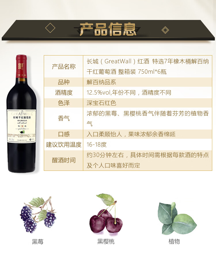 颜色:宝石红;采摘年份:2018年;口感:饱满;特性:精品葡萄酒;国产/进口:国产;适用场景:家庭聚会,礼节拜访,商务宴请,婚礼婚宴,情侣约会,自斟自饮,闺蜜私语,派对活动;包装:整箱装;酸度:中酸;类别:红葡萄酒;葡萄品种:赤霞珠(Cabernet Sauvignon),蛇龙珠(Cabernet Gernischt),品丽珠(Cabernet Franc);类型:静止酒;香型:果香,植物;产地:中国大陆;容量:750mL;甜度:干型;系列:特选;保质期:3650天;酒精度:12.5%vol;原产地:中国大陆;存储方法:避免阳光直射,于5℃~25℃干燥通风处卧放或倒放为宜。;容量:750ml;产品重量:8.3kg;包装清单:长城(GreatWall)红酒 特选7橡木桶解百纳干红葡萄酒 750ml*6瓶 整箱装*1箱;