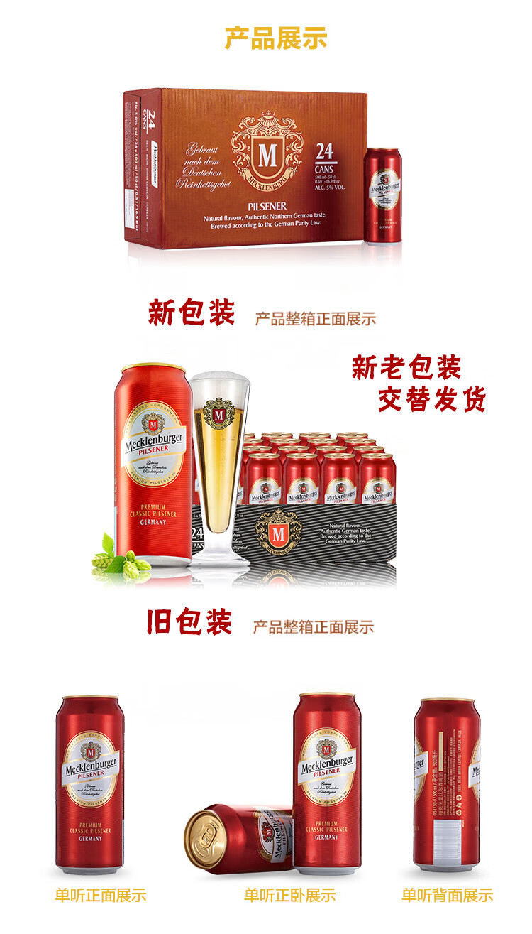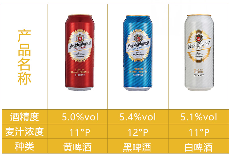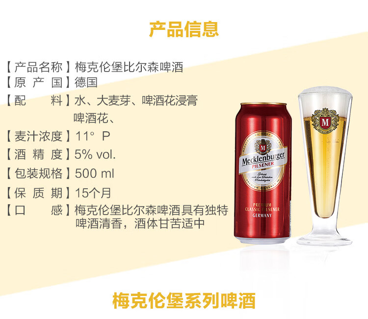 适用场景:家庭聚会,烧烤撸串,酒吧夜店;包装:听装;容量:500mL;类别:黄啤酒;国产/进口:进口;产地:德国;原料:水、大麦芽、啤酒花浸膏、啤酒花;保质期:15个月;酒精度:5.0%vol;原产地:德国;原麦汁浓度:11°P;存储方法:常温保存;产品重量:12.72kg;容量:500mL;包装清单:德国进口梅克伦堡(Mecklenburger)比尔森啤酒500ml*24整箱装;