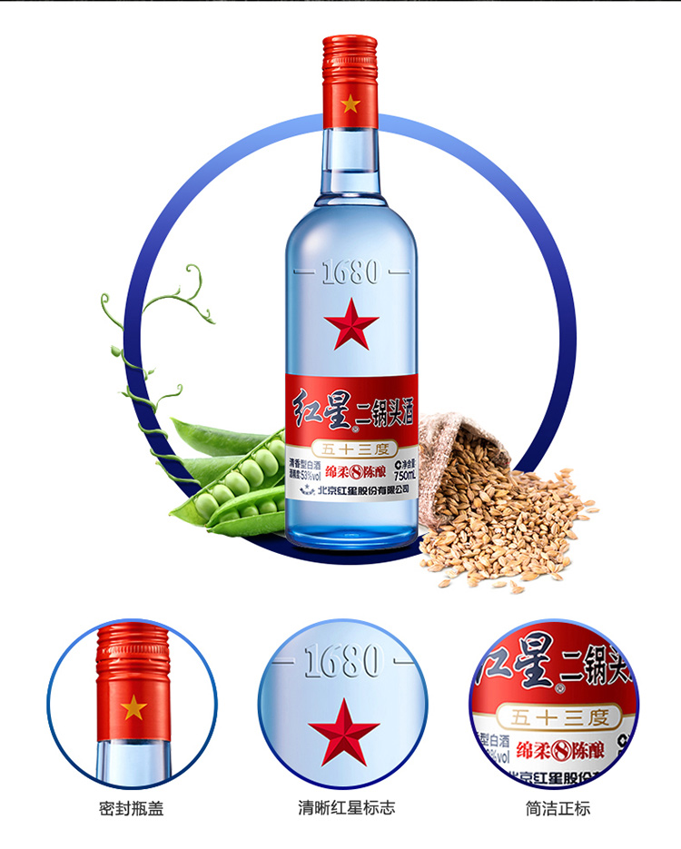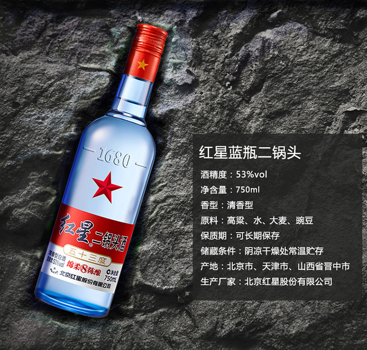 包装:瓶装;容量:500-749mL;香型:清香型;度数:50度及以上;香型:清香型;产地:北京市,天津市,山西晋中市;酒精度:53%vol;包装:瓶装;产品重量:1300g;容量:750ml;包装清单:红星 蓝瓶二锅头 绵柔8陈酿53度 750ml;