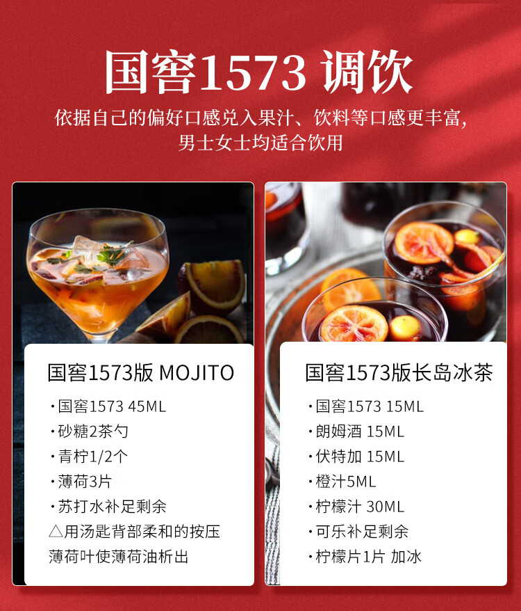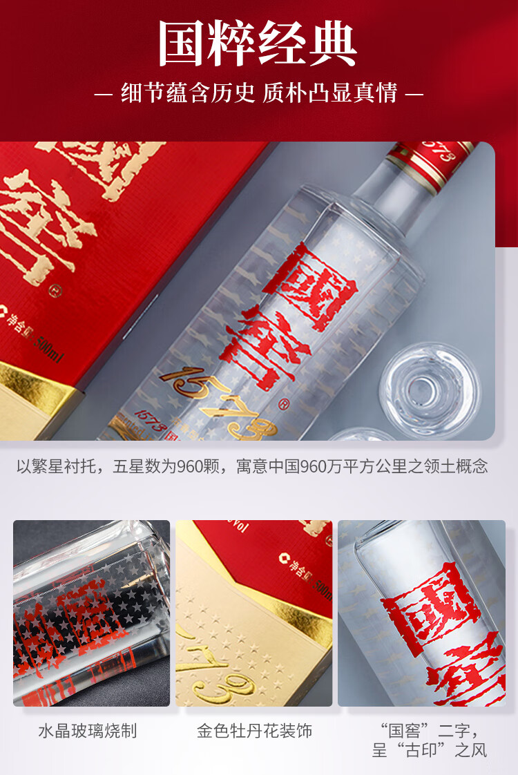 包装:整箱装;容量:376-499mL;香型:浓香型;产地:四川;度数:35-39度;酒精度:38%vol;容量:500ml*6瓶;产品重量:6000g;包装清单:国窖1573 38度×6;