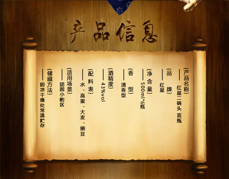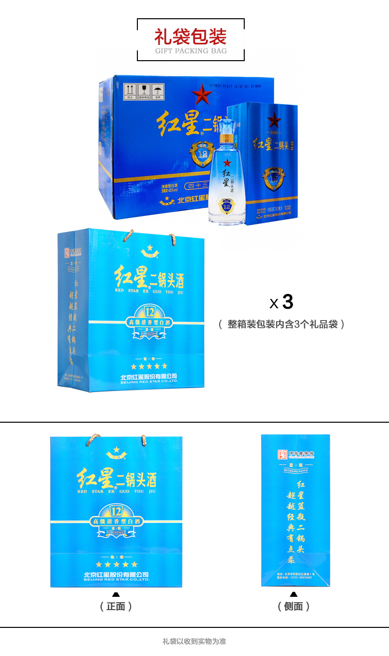 包装:整箱装;容量:376-499mL;香型:清香型;度数:40-49度;产地:北京;酒精度:43%vol;产品重量:10220g;容量:500ml;包装清单:红星 红星二锅头 蓝盒12 清香型 白酒 43度 500ml*6瓶 整箱装;