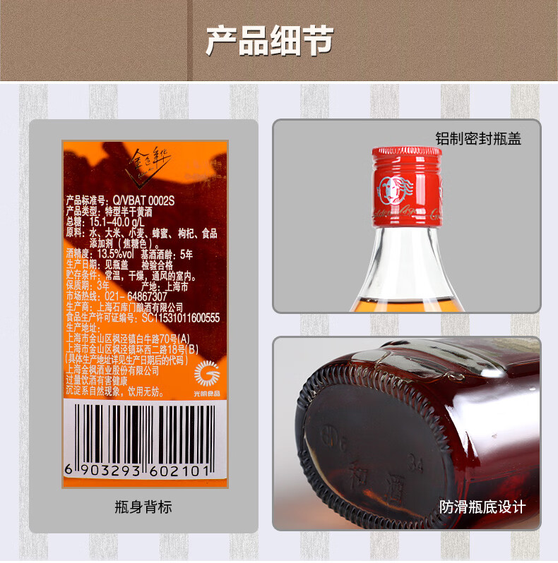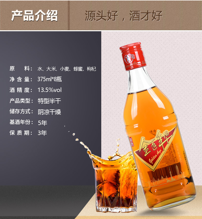 口味:半干型黄酒(总糖:15.0-40.0g/L);度数:10-19度;产地:上海;适用场景:商务宴请,礼节拜访,家庭聚会,朋友小聚,自斟自饮;包装:整箱装;容量:500mL以下;保质期:3年;酒精度:13.5度;存储方法:阴凉避光处;容量:375mL;产品重量:0.3kg;包装清单:和酒 金色年华5年陈 13.5度 375ml*8瓶 整箱*1;
