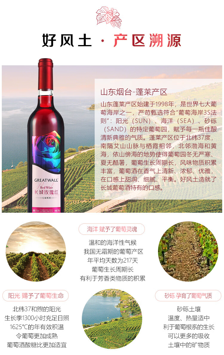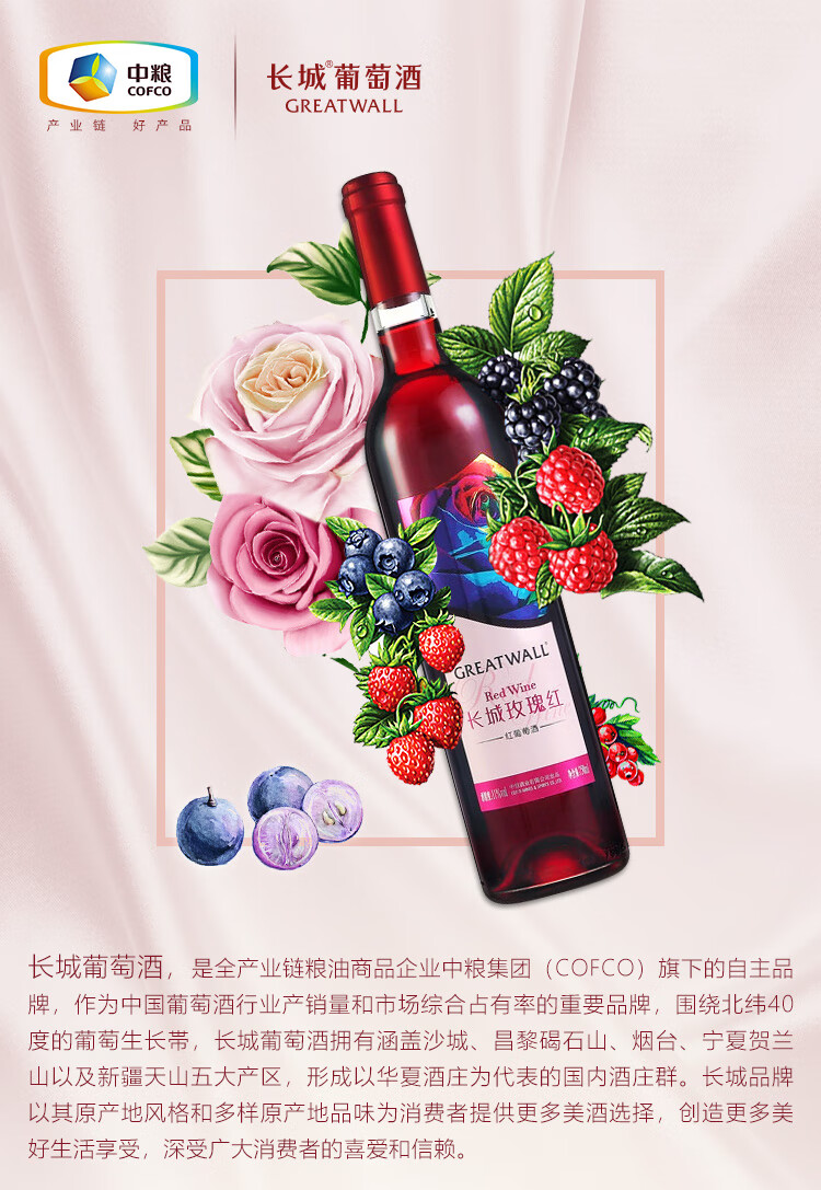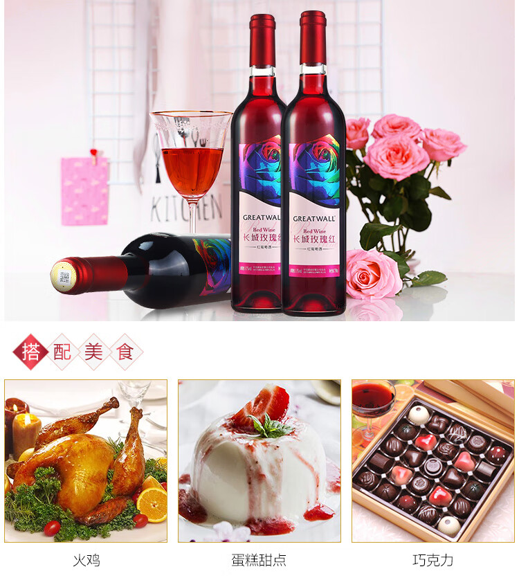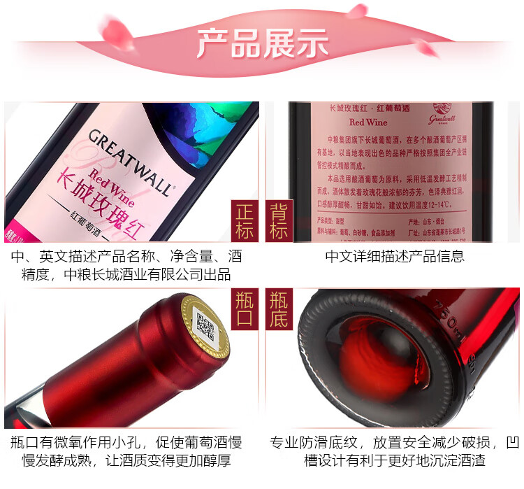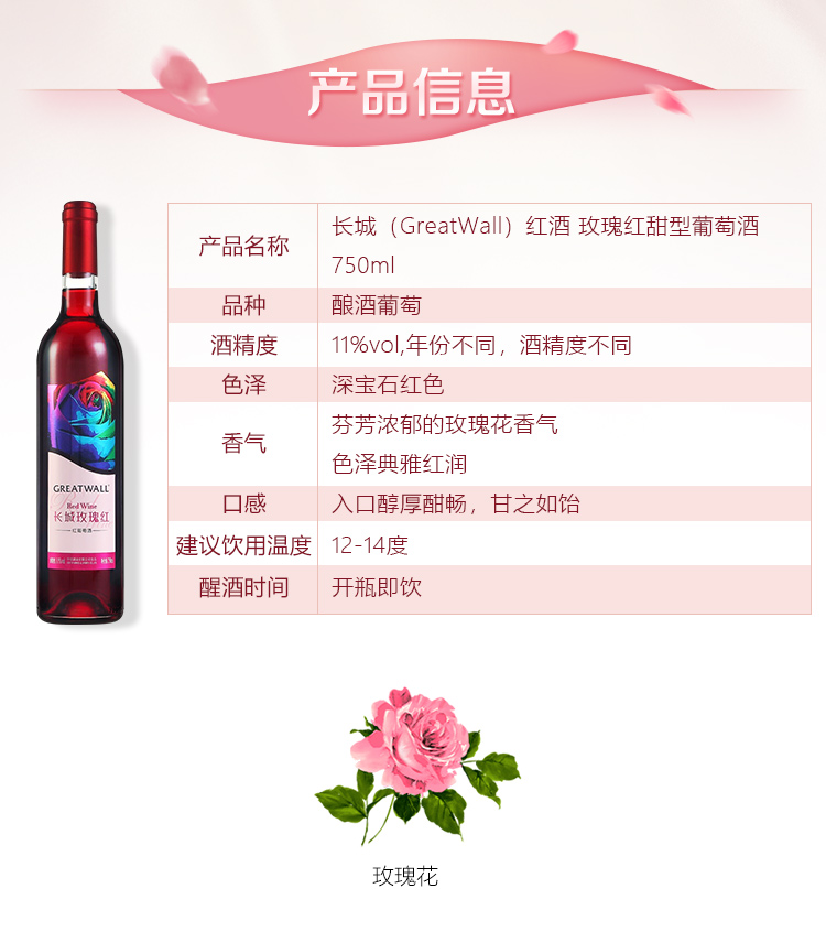 颜色:宝石红;口感:清新;特性:其它;国产/进口:国产;适用场景:家庭聚会,礼节拜访,商务宴请,婚礼婚宴,情侣约会,自斟自饮,闺蜜私语,派对活动;包装:瓶装;酸度:中酸;类别:红葡萄酒;葡萄品种:其它;类型:静止酒;香型:花香;产地:中国大陆;容量:750mL;甜度:甜型;系列:玫瑰红;保质期:2920天;酒精度:11%vol;原产地:中国大陆;存储方法:避免阳光直射,于5℃~25℃干燥通风处卧放或倒放为宜。;容量:750ml;产品重量:1.26kg;包装清单:长城(GreatWall)红酒 玫瑰红甜型葡萄酒 750ml*1瓶;