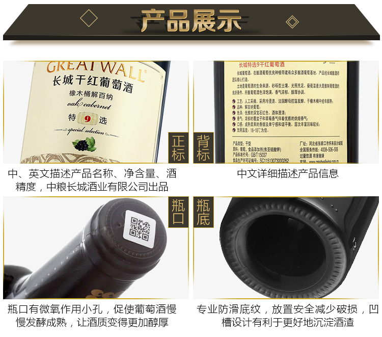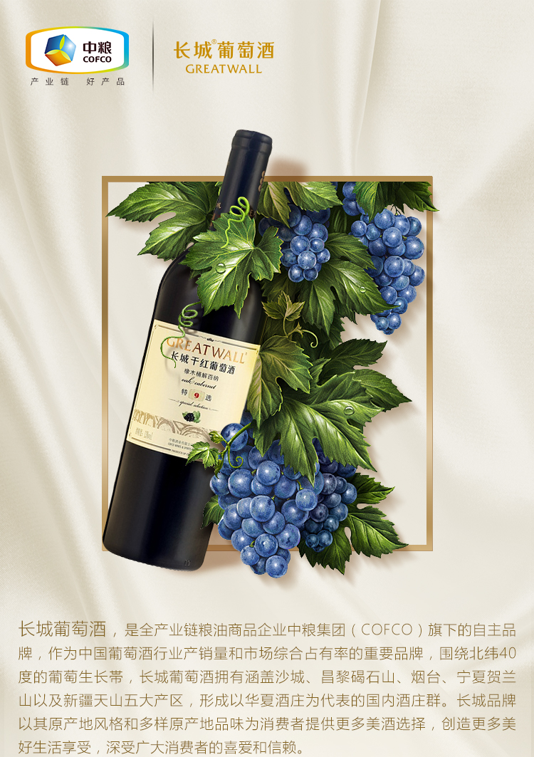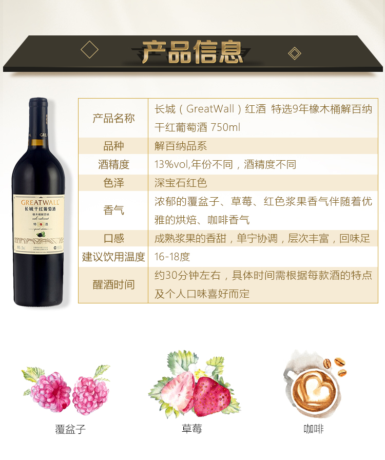 长城 特选9年橡木桶解百纳干红葡萄酒 750ml 单瓶装 中粮出品