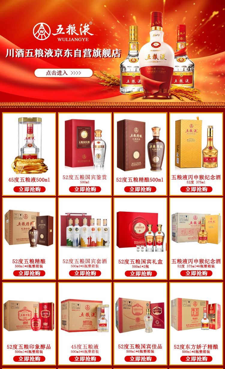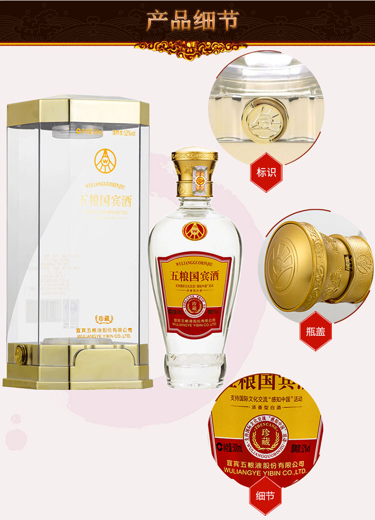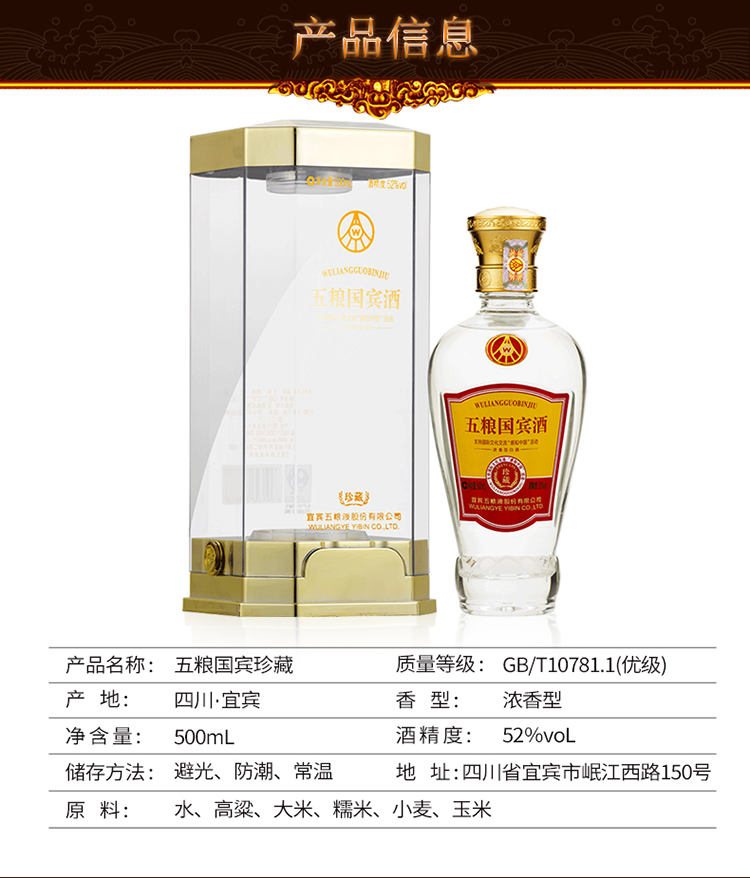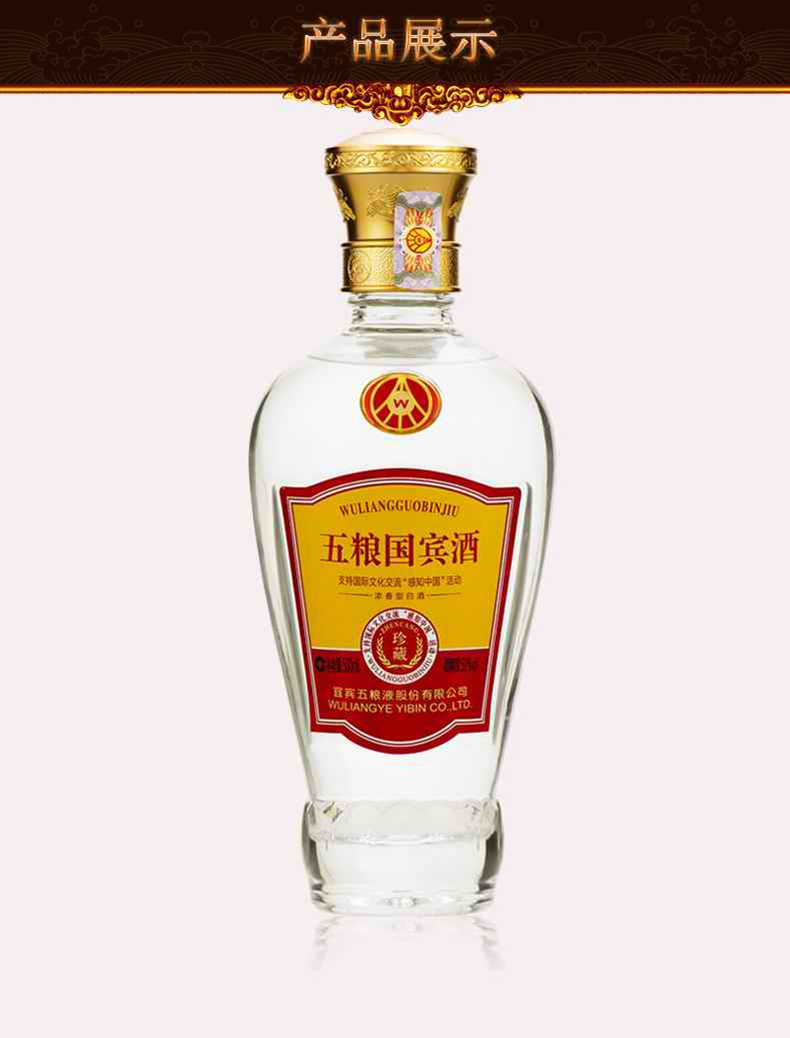 包装:瓶装;容量:500-749mL;香型:浓香型;产地:四川;度数:50度及以上;酒精度:52%vol;容量:500ml;产品重量:150g;包装清单:五粮液股份出品 五粮国宾珍藏 浓香型白酒 52度500ml 单瓶装;