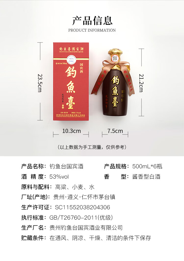 包装:整箱装;容量:500-749mL;香型:酱香型;产地:贵州;度数:50度及以上;酒精度:53%vol;容量:500ml;产品重量:7200g;包装清单:包装盒×6、包装袋×3、包装箱×1;
