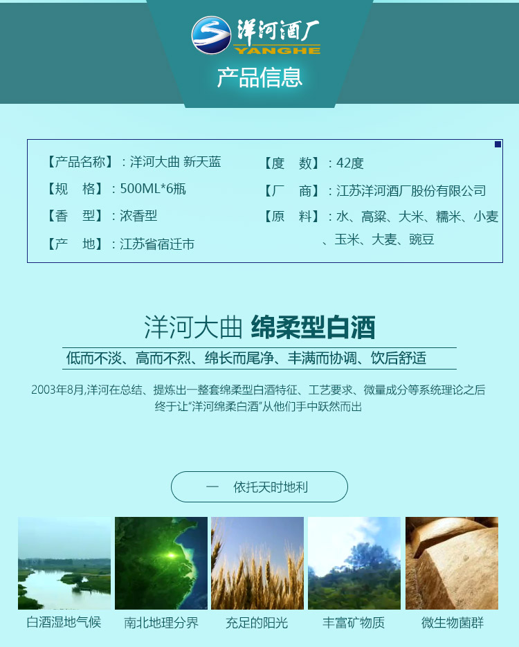 包装:整箱装;容量:376-499mL;香型:浓香型;度数:40-49度;香型:浓香型;产地:江苏;酒精度:42%vol;包装:整箱装;产品重量:0g;容量:500ml;包装清单:洋河大曲 新天蓝 42度 500ml×6、礼袋×3;