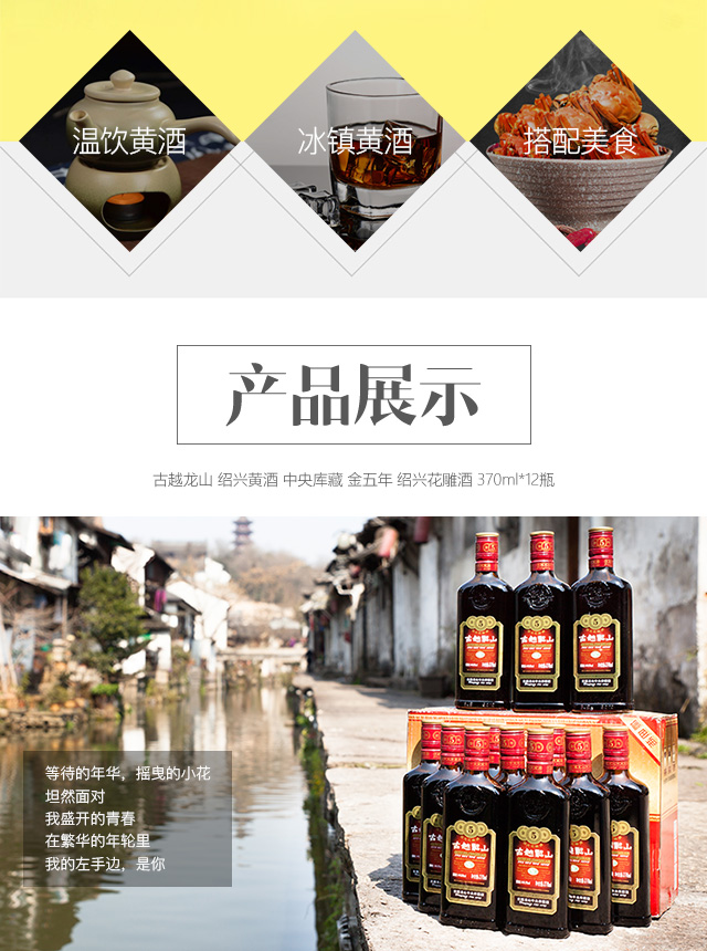 口味:半干型黄酒(总糖:15.0-40.0g/L);度数:10-19度;产地:其它;适用场景:家庭聚会,礼节拜访,商务宴请,自斟自饮,朋友小聚;包装:整箱装;容量:500mL以下;容量:370ml;产品重量(kg):9.380;包装:整箱;存储方法:阴凉干燥;口味:半干型黄酒(总糖:15.0-40.0g/L);酒精度:14;保质期:60个月;原产地:其它;包装清单:古越龙山金五年绍兴花雕酒370ml*12瓶*1;
