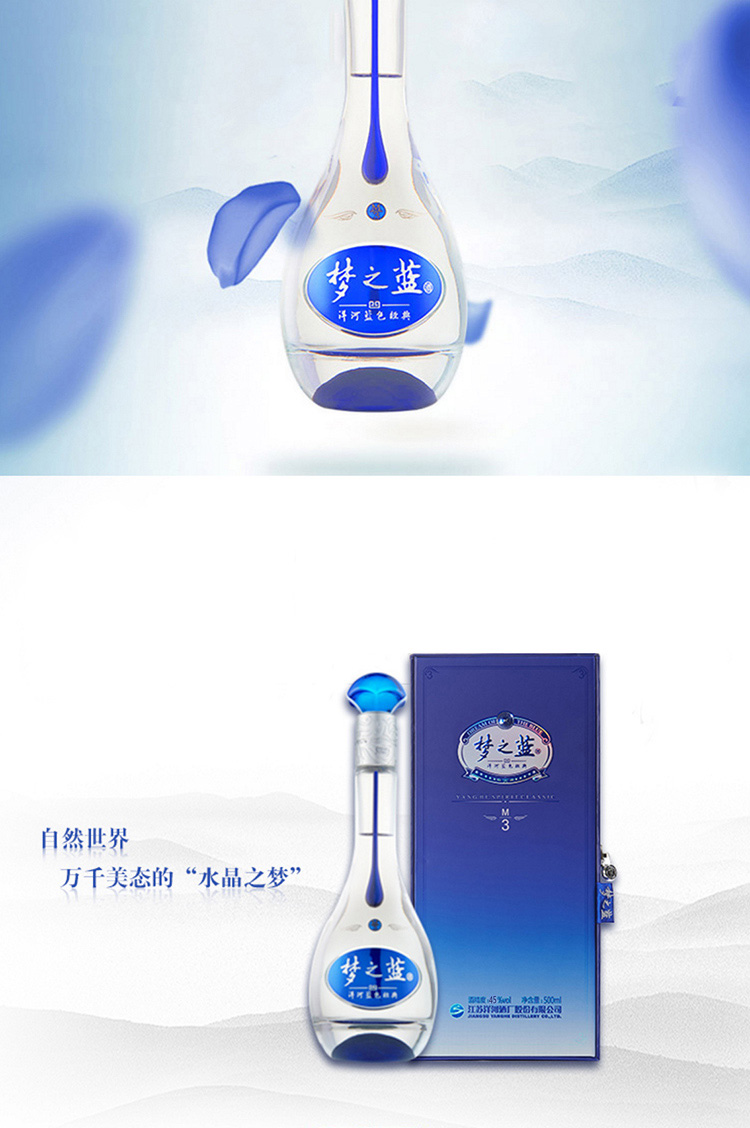 包装:整箱装;容量:376-499mL;香型:浓香型;度数:40-49度;香型:浓香型;产地:江苏;度数:45;包装:整箱装;产品重量(kg):12kg;容量:500ml;包装清单:45度洋河梦之蓝M3 500ml×4 礼袋×2;
