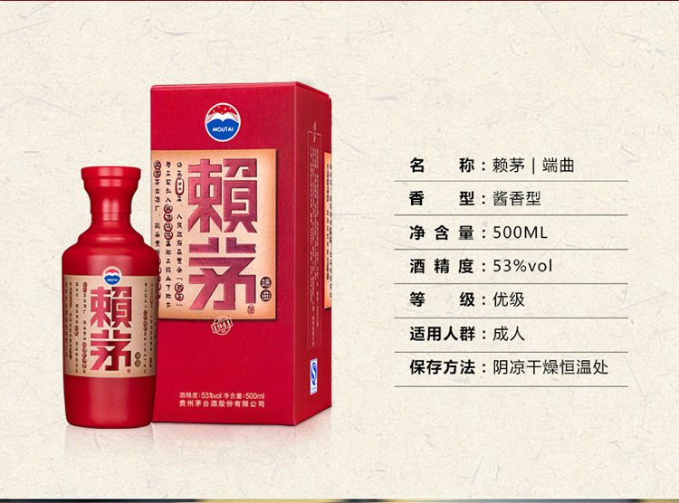 容量:376-499mL;香型:酱香型;包装:瓶装;香型:酱香型;产地:贵州;酒精度:53度;包装:瓶装;产品重量:1650g;容量:500;包装清单:茅台 赖茅 端曲 53度 500ml*1瓶;