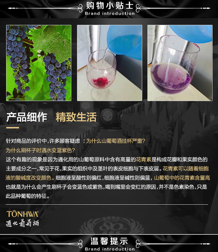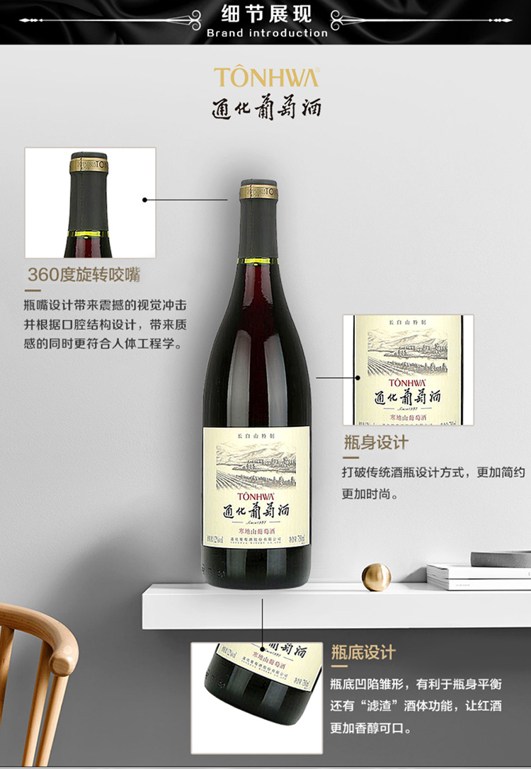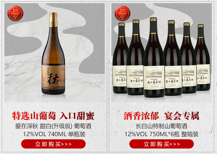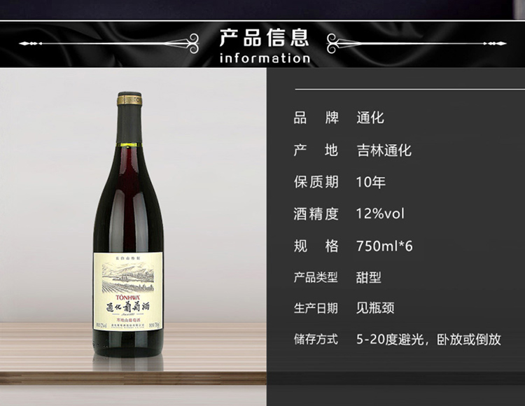 颜色:宝石红;口感:柔和;特性:精品葡萄酒,其它,普通餐酒;国产/进口:国产;适用场景:礼节拜访,商务宴请,婚礼婚宴,情侣约会,家庭聚会,收藏,自斟自饮,闺蜜私语,派对活动;包装:整箱装;类别:冰酒/贵腐/甜酒,红葡萄酒;葡萄品种:其它;类型:静止酒;香型:花香,果香,其它;产地:中国大陆;容量:750mL以上;甜度:甜型;系列:长白山特制;保质期:10年;酒精度:12%vol;原产地:中国大陆;存储方法:5-20℃避免阳光直射,卧放或倒放;容量:750ml*6;产品重量:0kg;包装清单:通化长白山特制山葡萄酒750ml×6瓶;