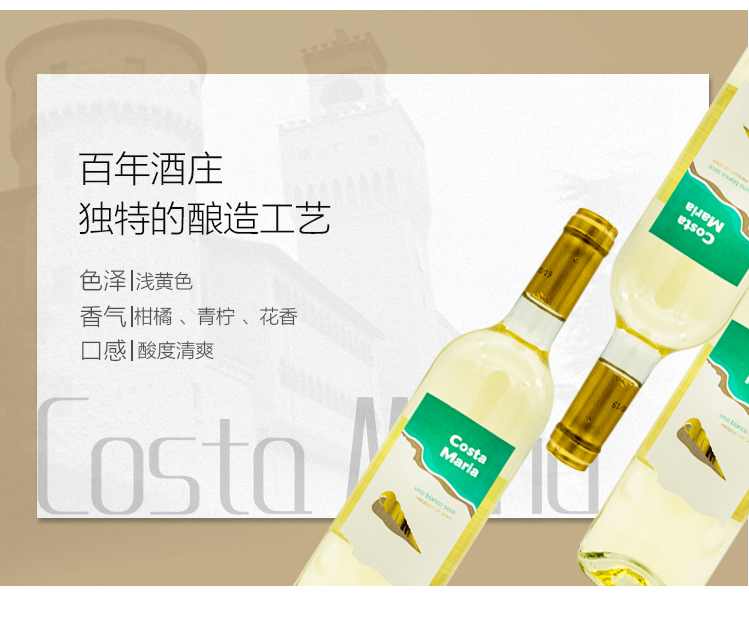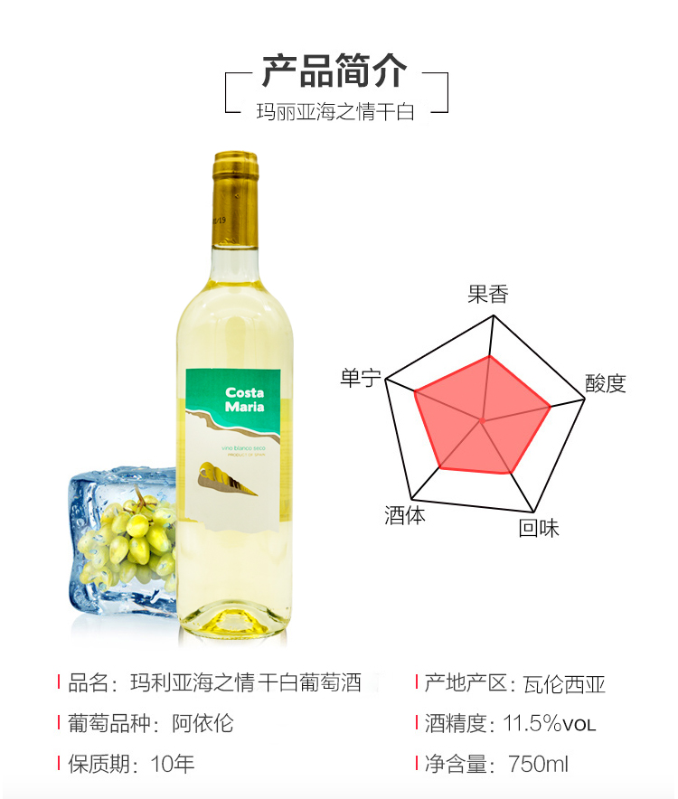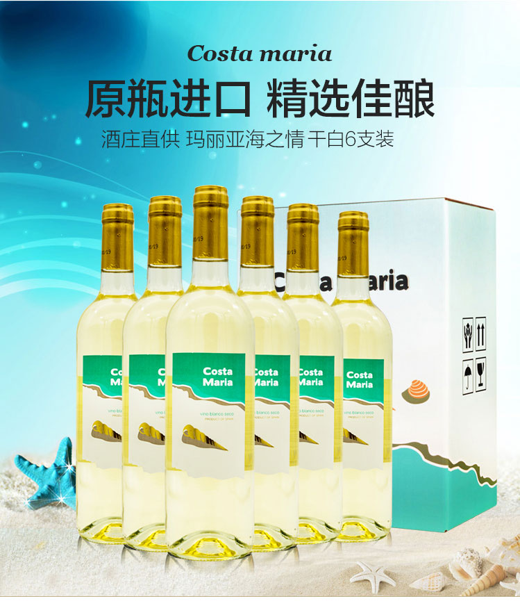 颜色:柠檬黄;口感:清新;特性:其它;国产/进口:进口;适用场景:家庭聚会,自斟自饮,闺蜜私语,派对活动;包装:整箱装;类别:白葡萄酒;葡萄品种:其它;类型:其它;香型:花香,果香;产地:西班牙;容量:750mL;甜度:干型;保质期:3650;酒精度:11.5%vol;原产地:西班牙;存储方法:避光,卧放,常温;产品重量:6.9kg;容量:750;包装清单:玛丽亚海之情干白葡萄酒750ml*6瓶;