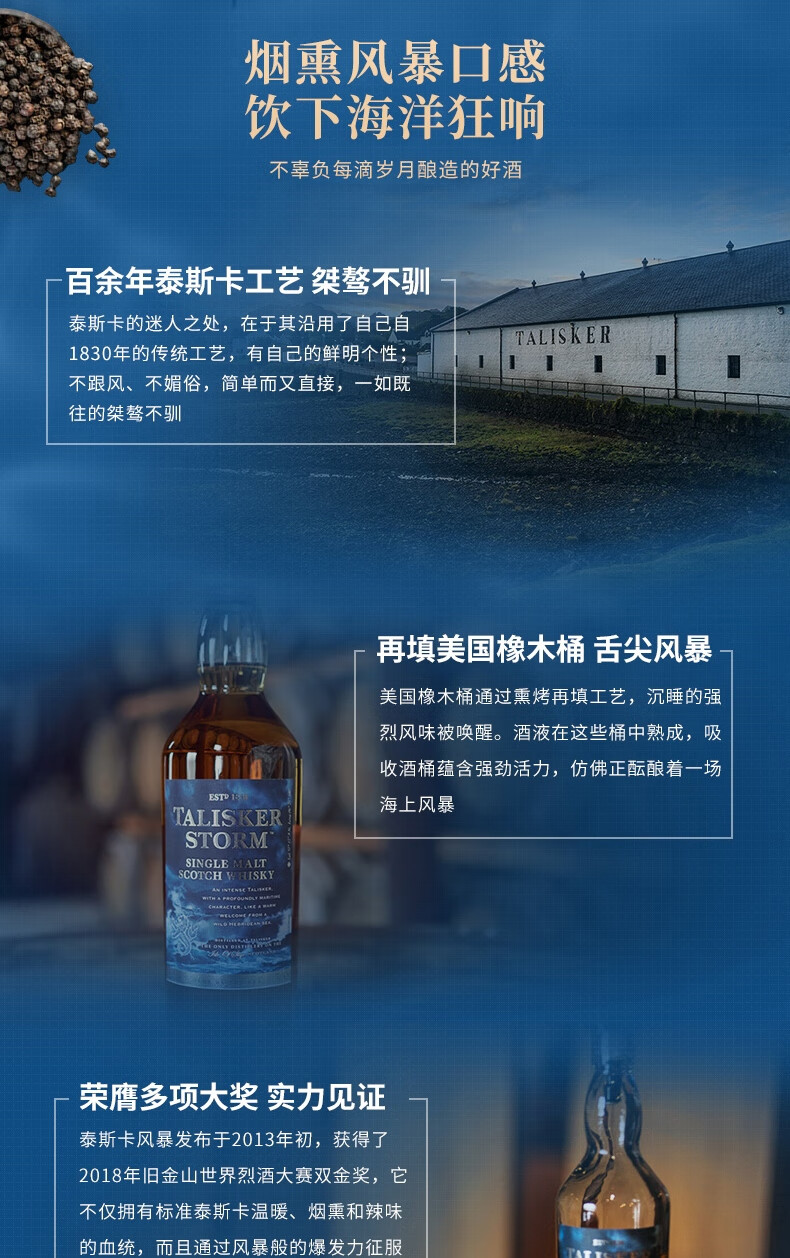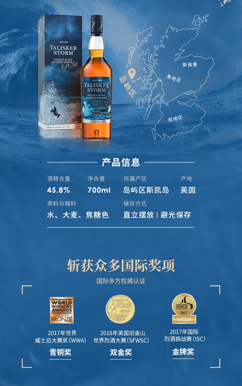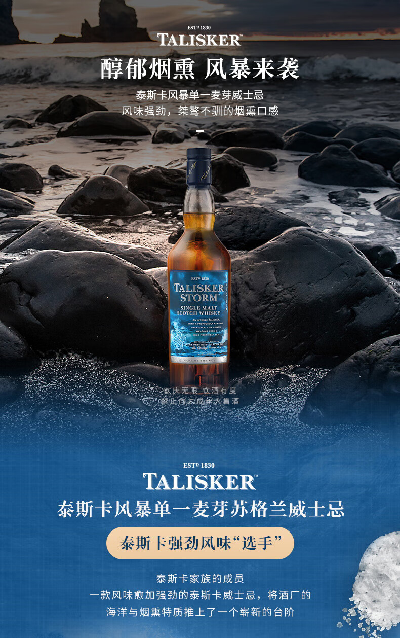 类型:单一麦芽威士忌;产地:其它;适用场景:自斟自饮,亲友馈赠,家庭聚会,商务宴请,情侣约会,闺蜜私语;包装:瓶装;容量:700-999mL;阶段:进阶优选;原料:水、大麦芽;保质期:无;酒精度:45.8%vol;存储方法:常温避光保存;产品重量:1.33kg;容量:700mL;包装清单:泰斯卡(Talisker)洋酒 岛屿产区 风暴系列单一麦芽苏格兰威士忌700ml *1;