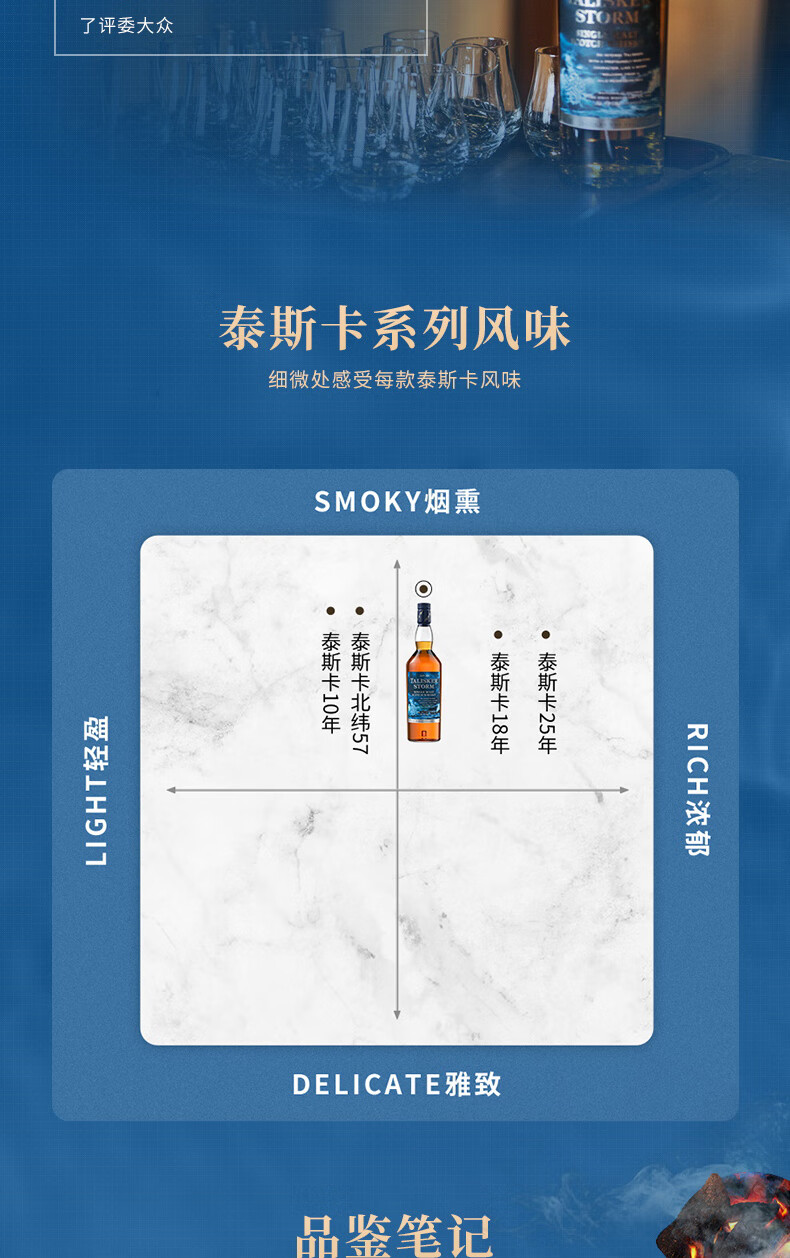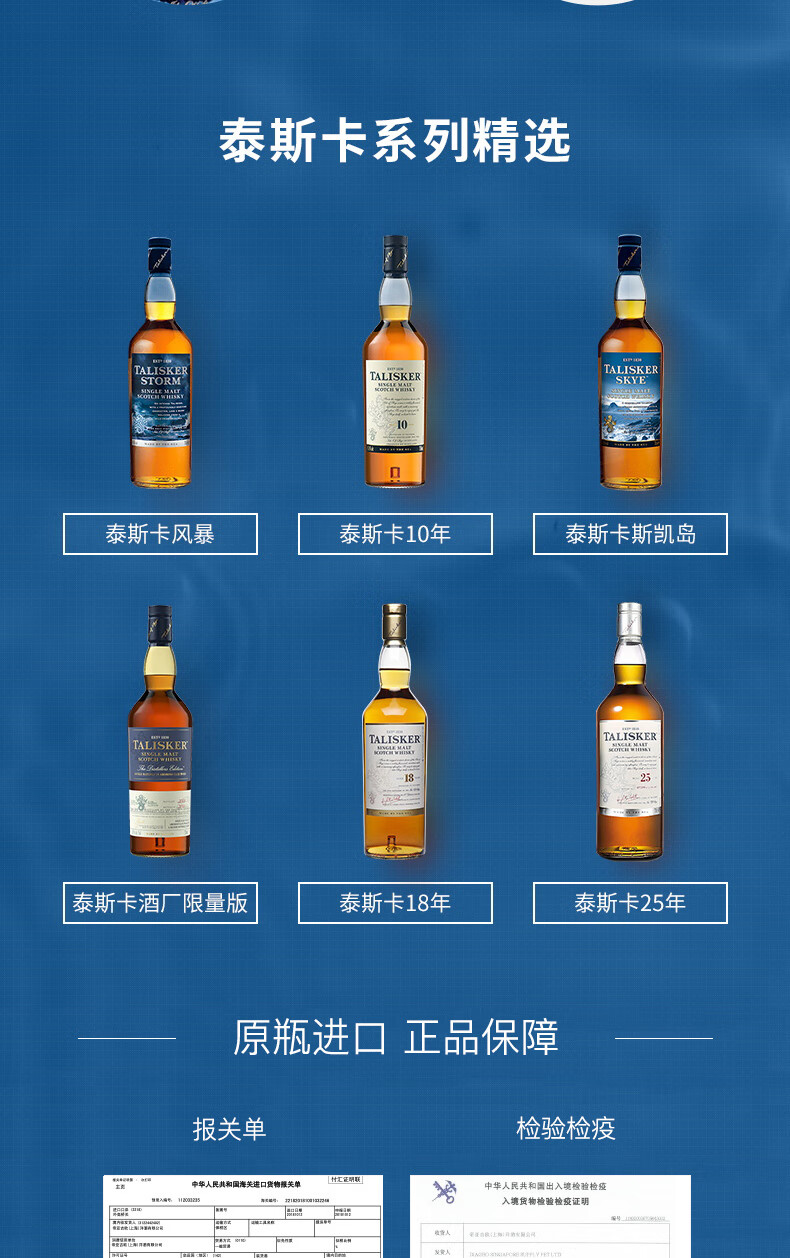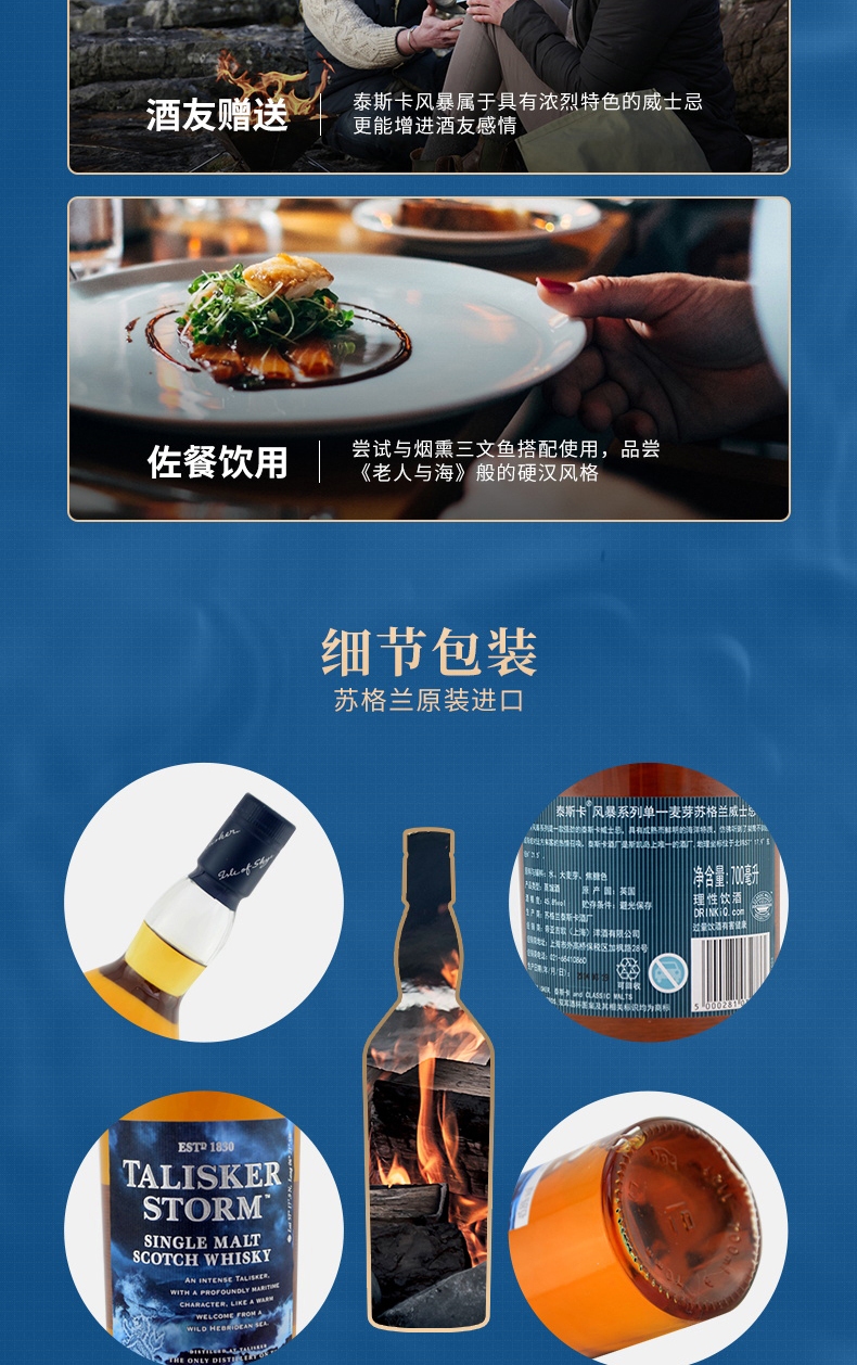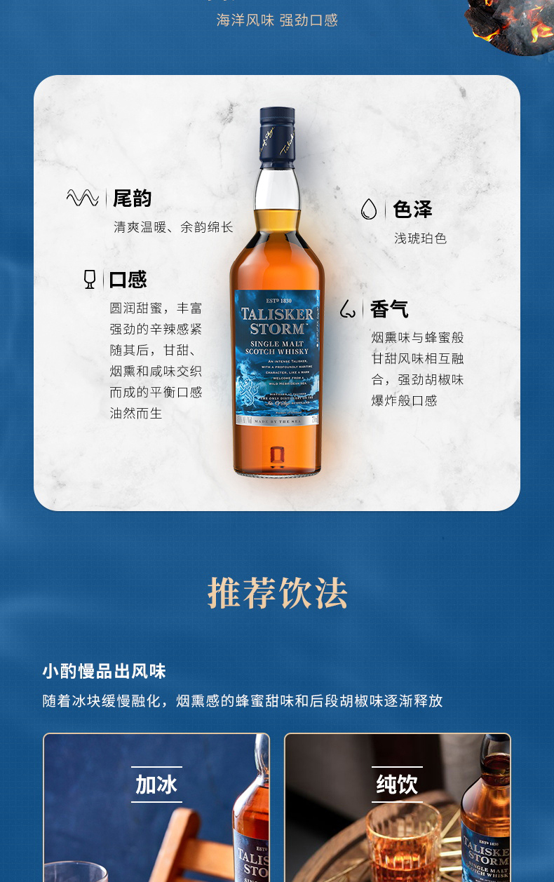 类型:单一麦芽威士忌;产地:其它;适用场景:自斟自饮,亲友馈赠,家庭聚会,商务宴请,情侣约会,闺蜜私语;包装:瓶装;容量:700-999mL;阶段:进阶优选;原料:水、大麦芽;保质期:无;酒精度:45.8%vol;存储方法:常温避光保存;产品重量:1.33kg;容量:700mL;包装清单:泰斯卡(Talisker)洋酒 岛屿产区 风暴系列单一麦芽苏格兰威士忌700ml *1;