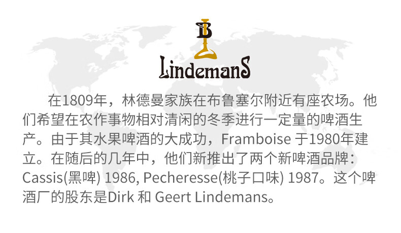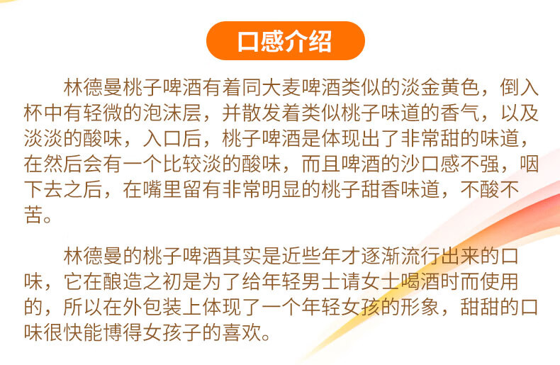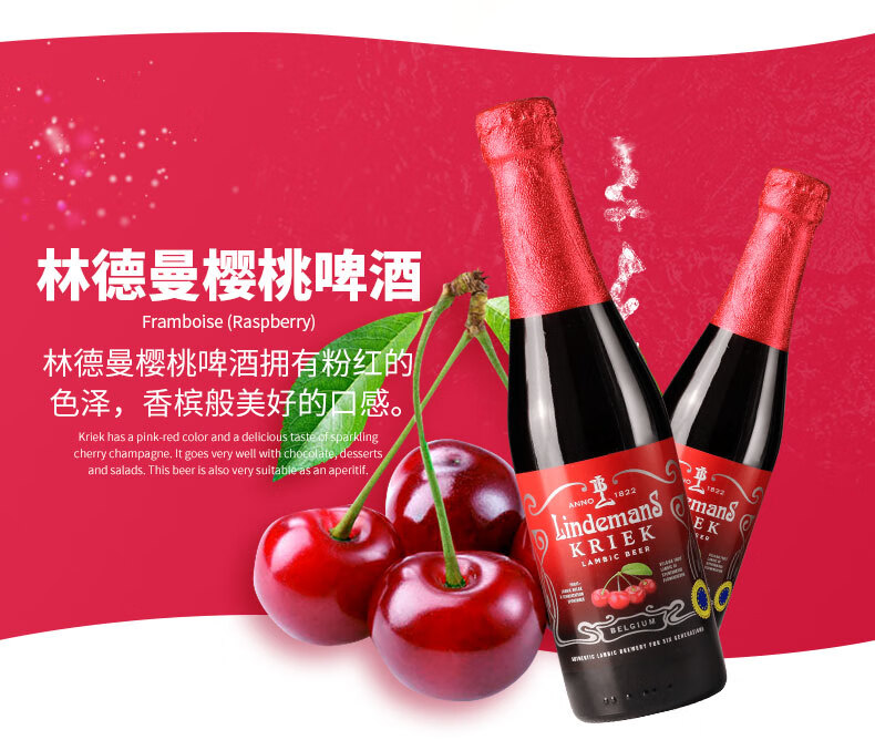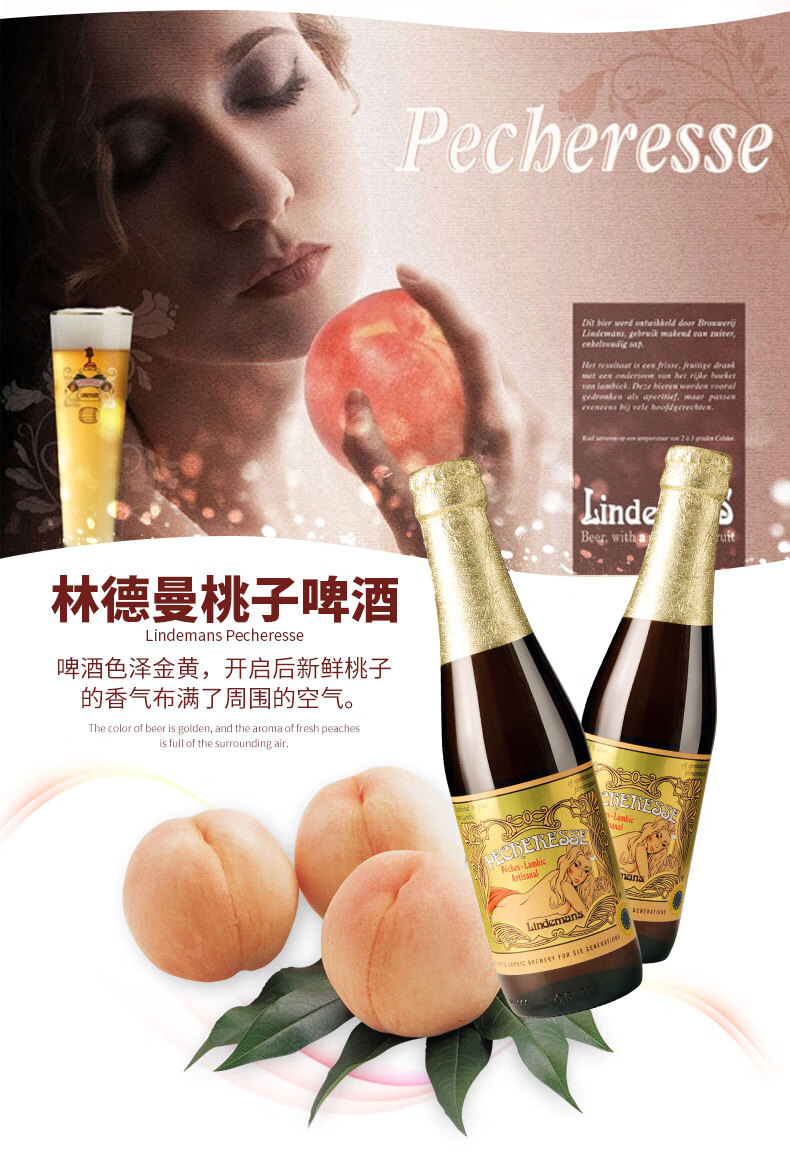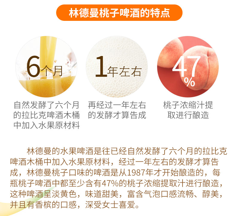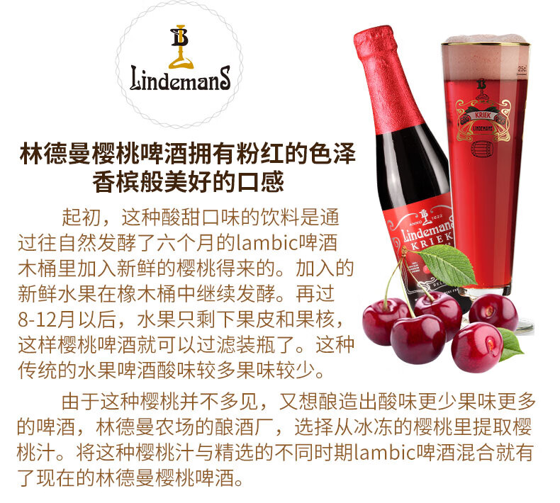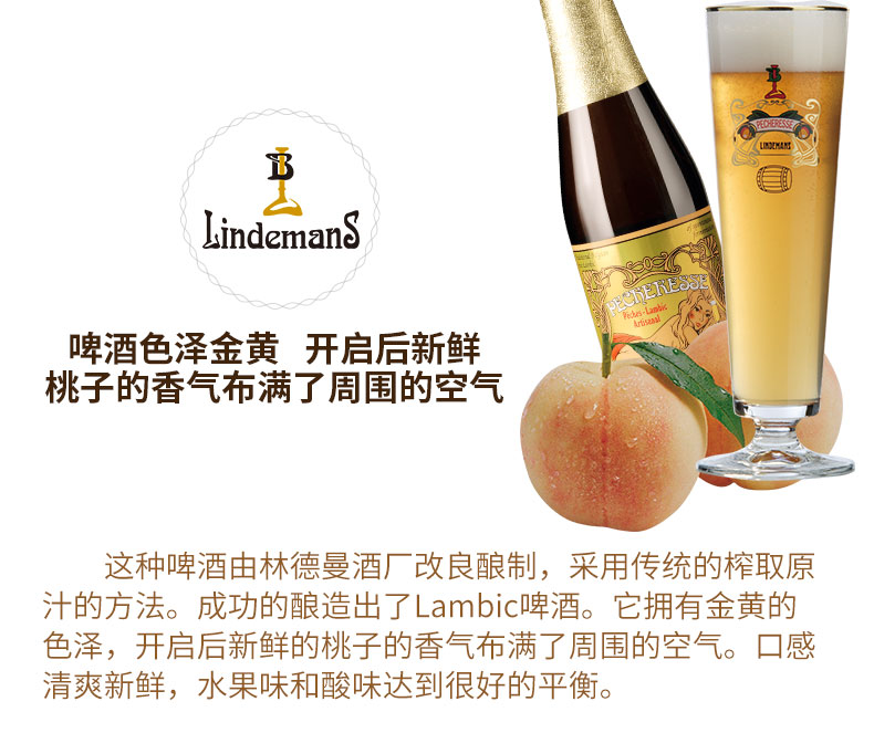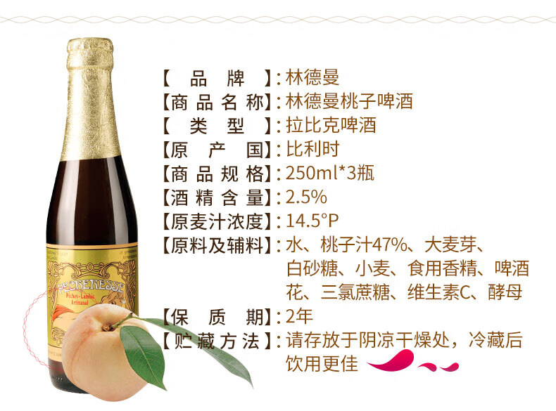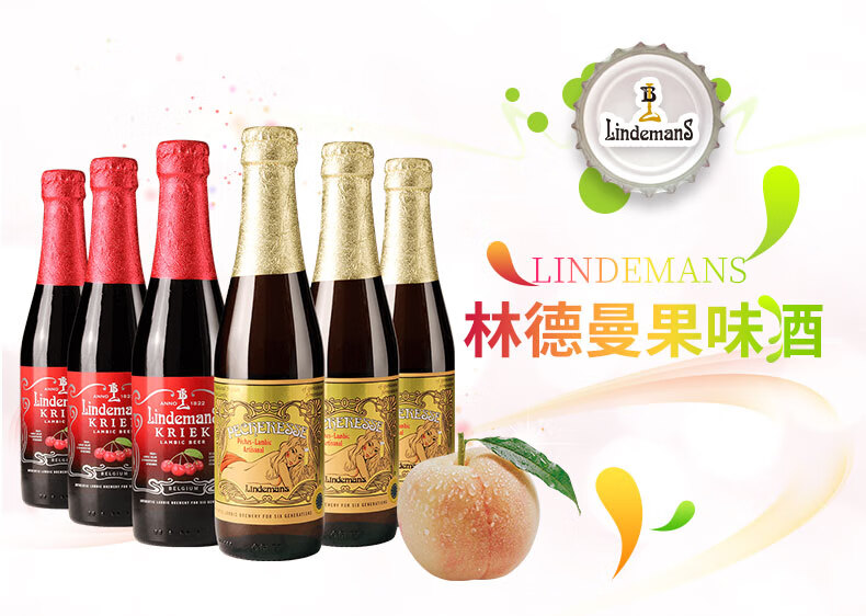 国产/进口:进口;产地:比利时;适用场景:礼节拜访,家庭聚会,自斟自饮,情侣约会,派对必备,酒吧夜店;包装:瓶装;容量:330mL以下;类别:精酿;原料:水、桃子汁47%、樱桃汁24%、大麦芽、白砂糖、小麦、 食用香精、 啤酒花、三氯蔗糖、维生素C、酵母;系列:拉比克啤酒;保质期:2年;酒精度:2.5%vol;原产地:比利时;原麦汁浓度:14.5°P;存储方法:请存放于阴凉干燥处,冷藏后饮用更佳;产品重量:3.5kg;容量:250ml;包装清单:Lindemans林德曼(樱桃*3/桃子*3)啤酒 组合装250ml*6瓶x1;