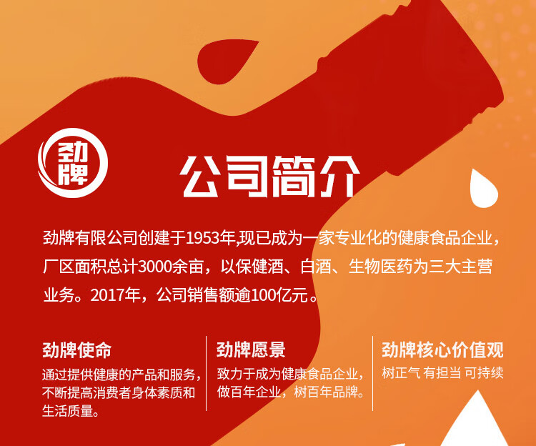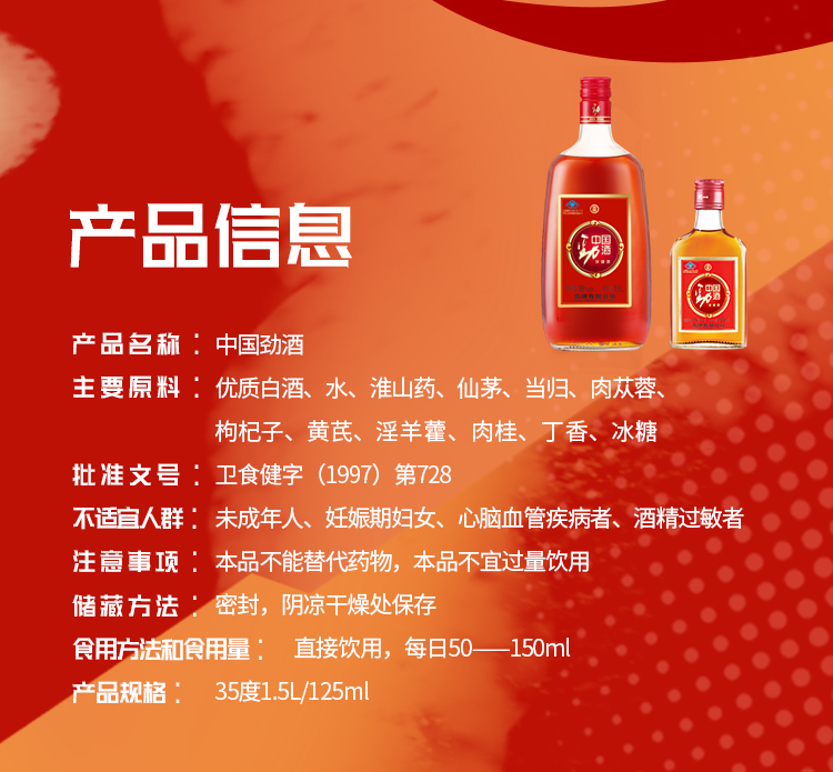 适用场景:家庭聚会,礼节拜访,商务宴请,自斟自饮;包装:礼盒装;容量:500mL以下;度数:35-39度;产地:湖北;保质期:3年;酒精度:35;存储方法:干燥恒温通风环境;容量:125mL;产品重量:4.1kg;包装清单:中国劲酒 35度 125ml x 12;